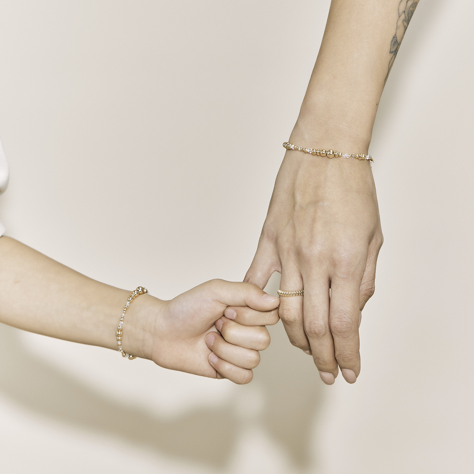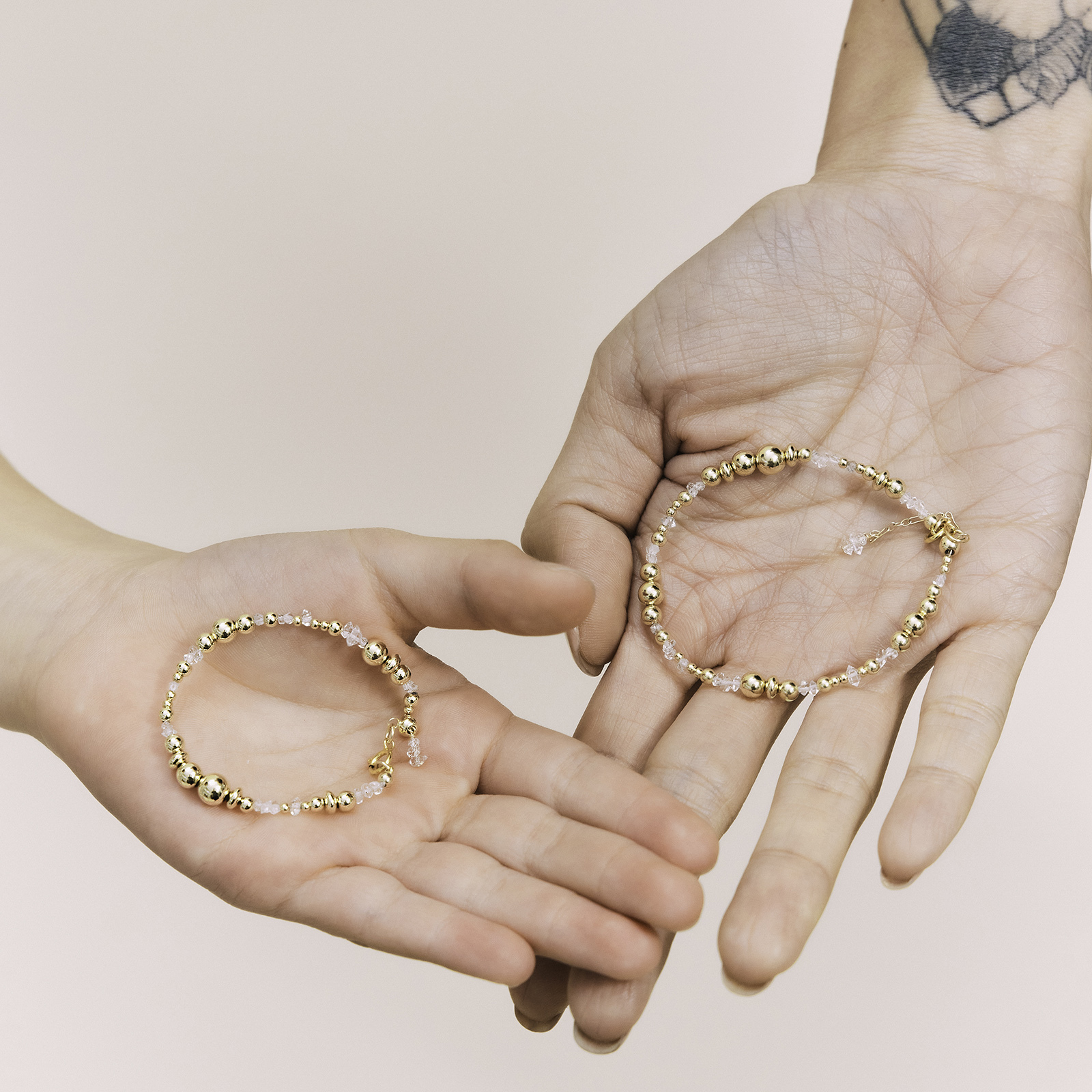 14K gold-filled strands paired with natural Herkimer diamonds are arranged in a scattered rhythm that sparkles.
