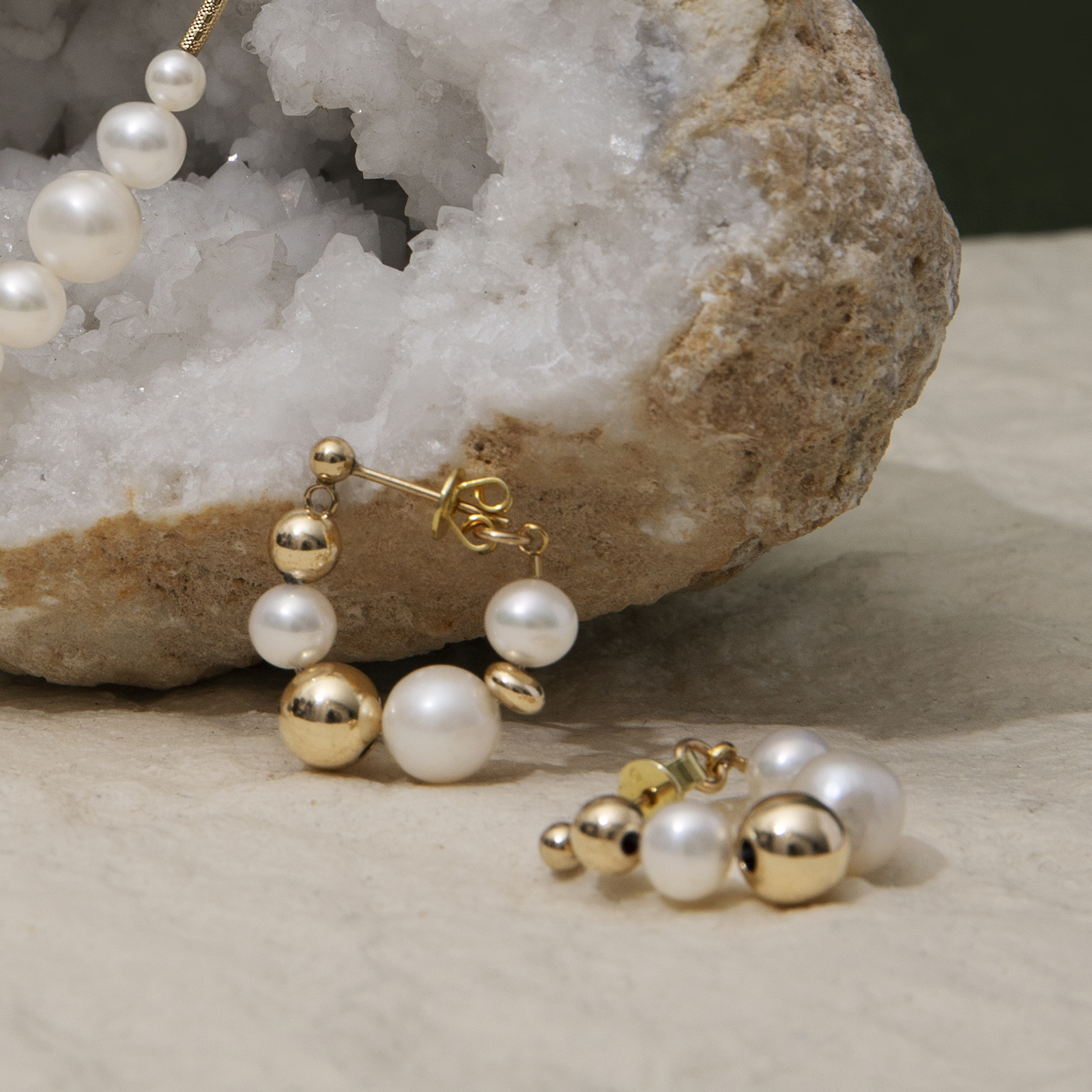 14K gold-filled strands are interwoven with natural freshwater pearls, forming a soft, curved line.