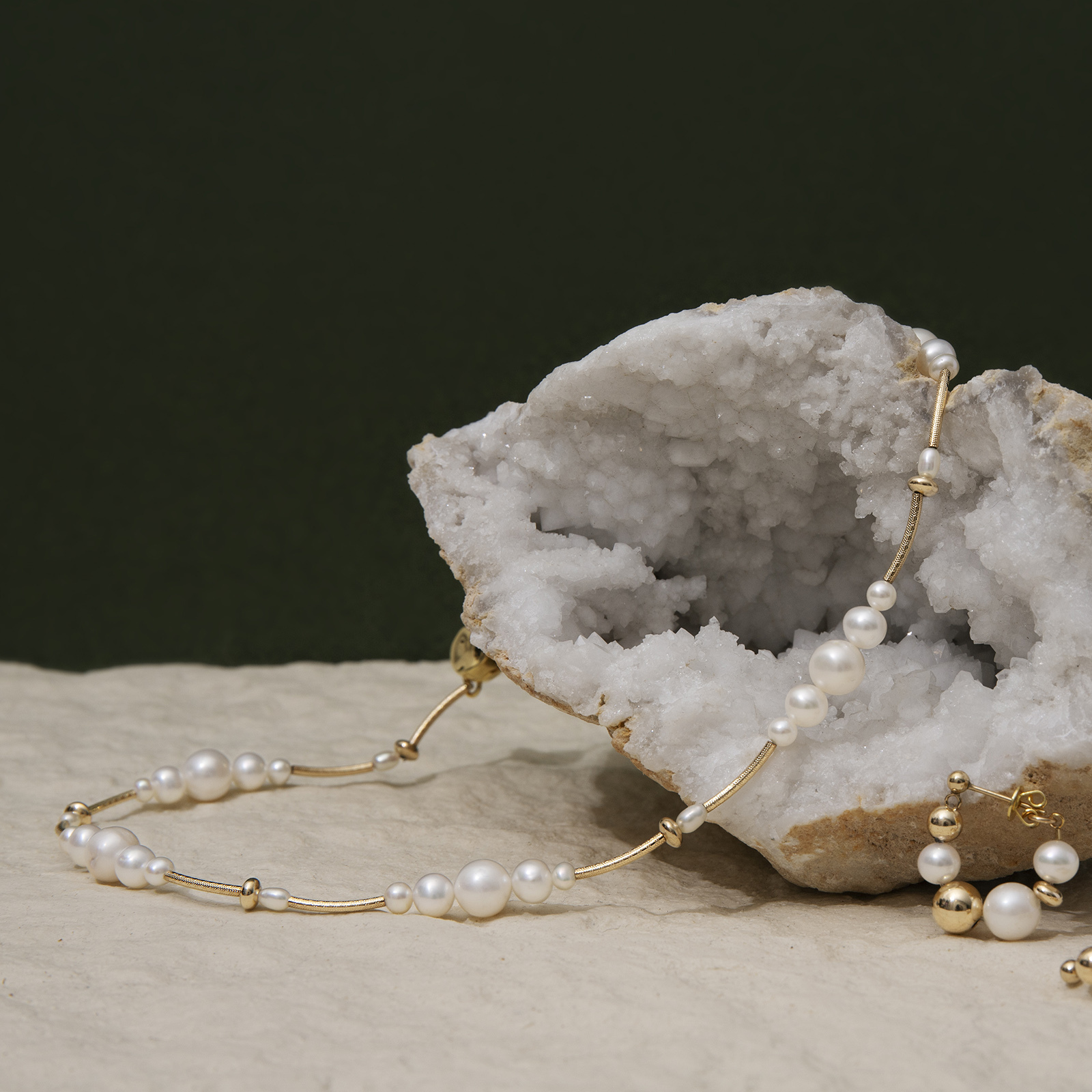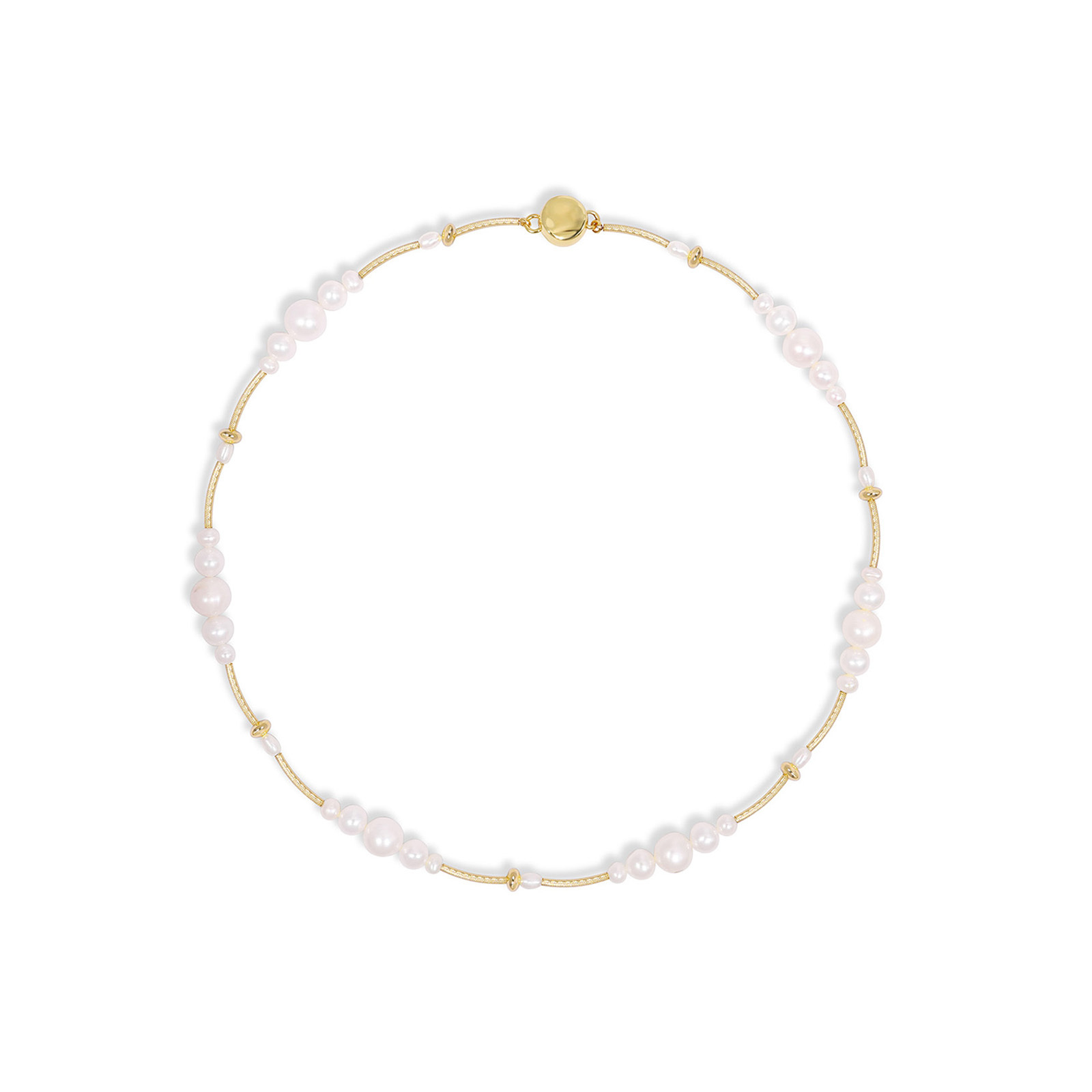 14K gold-filled and gold-plated brass threads weave together natural pearls of various sizes, creating a gentle rhythm.