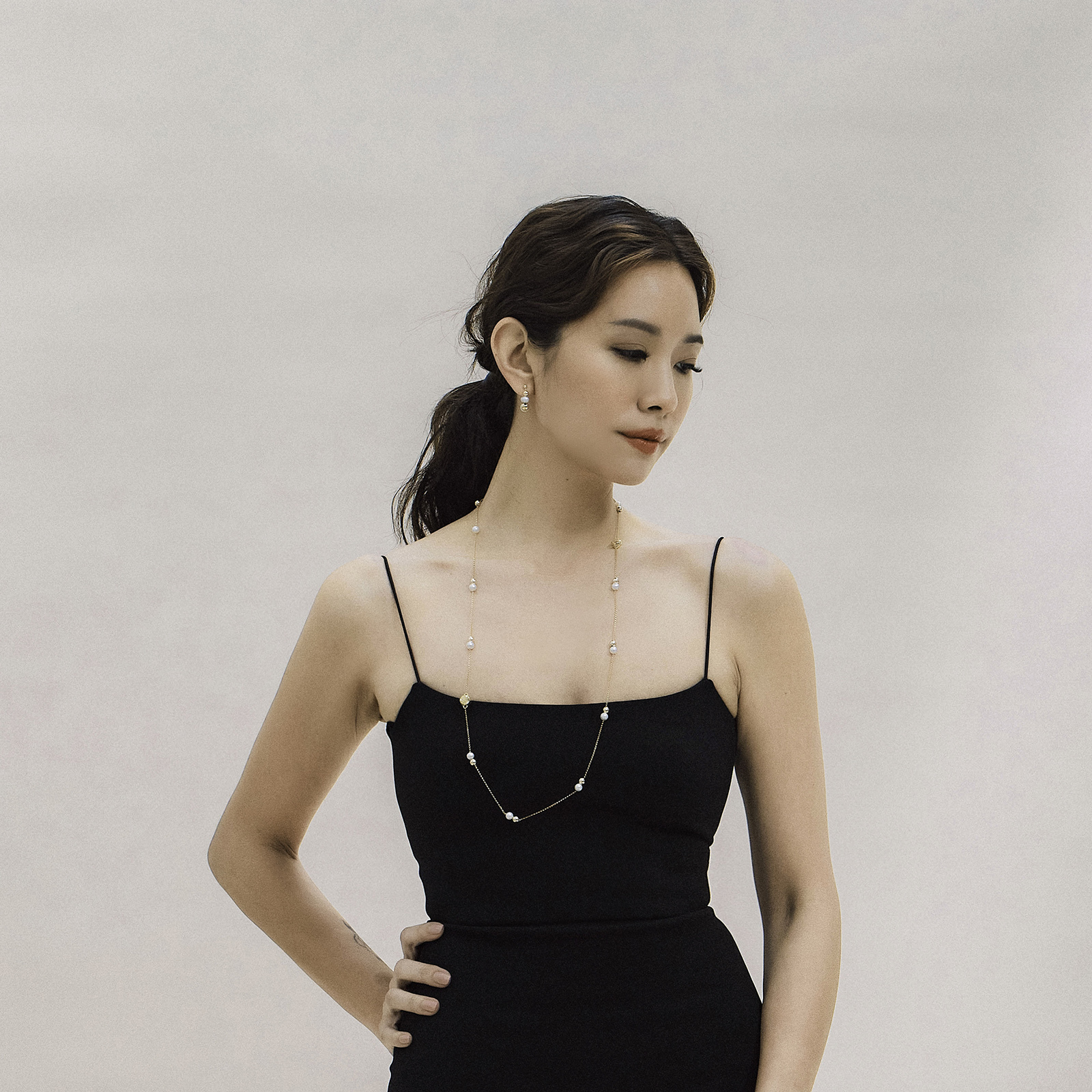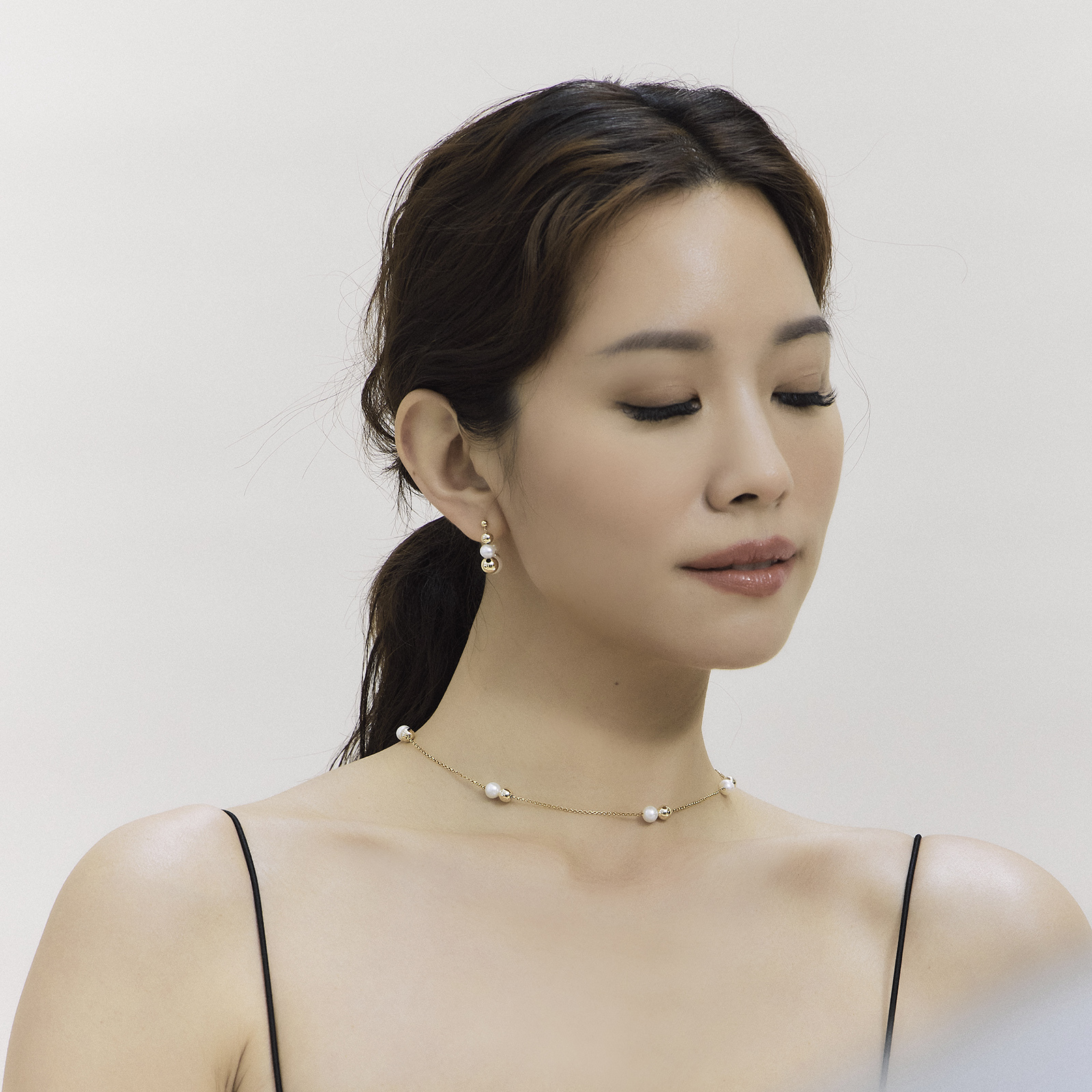 Natural freshwater pearls are strung on 14K gold-filled strands, evenly spaced along the chain like stars falling along a light beam.