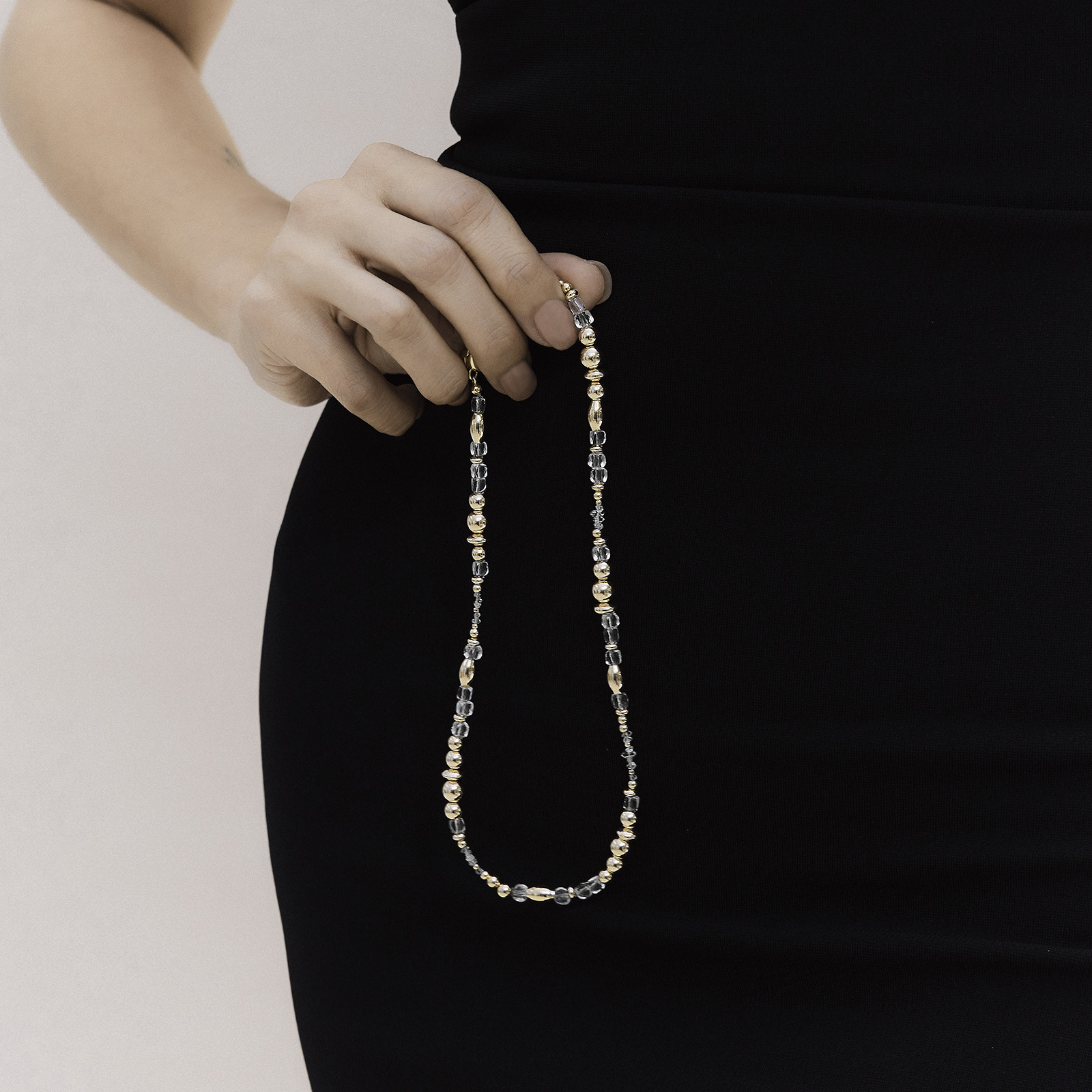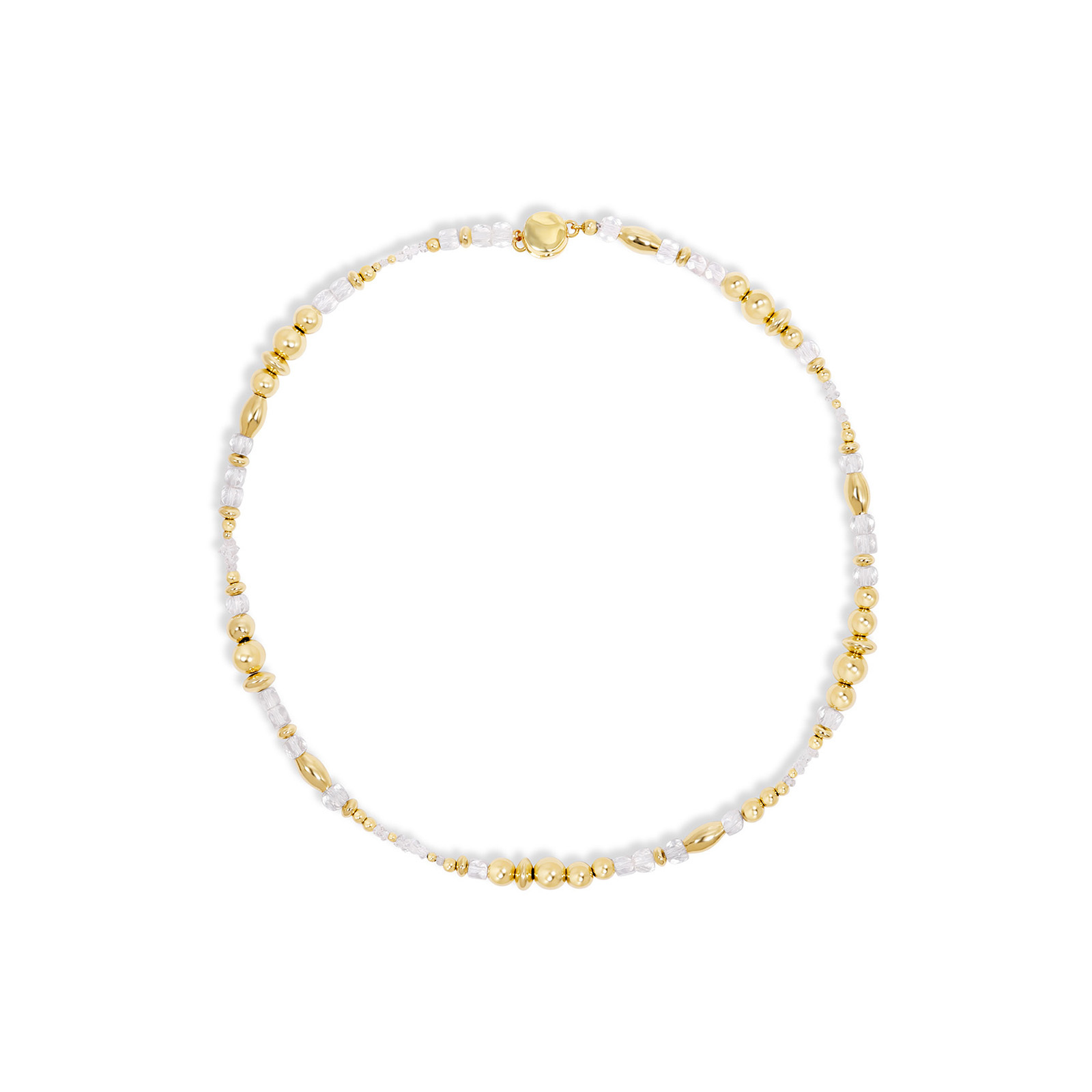 14K gold-filled strands are paired with Herkimer diamonds and clear quartz, arranged in an alternating pattern to exude clarity and energy.