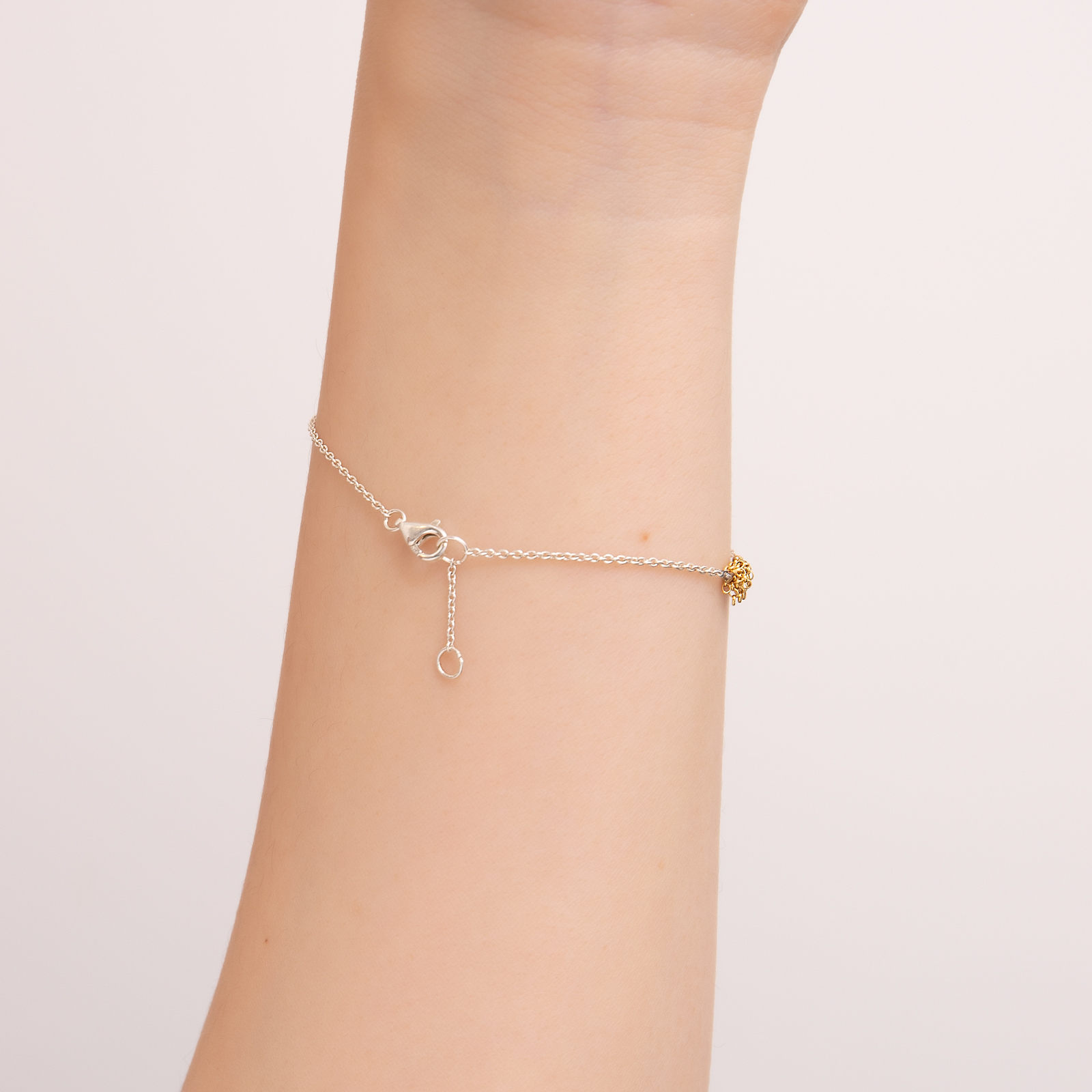 The 925 sterling silver chain, plated with rhodium, is adorned with handcrafted 14K gold-filled tassels. Every metal