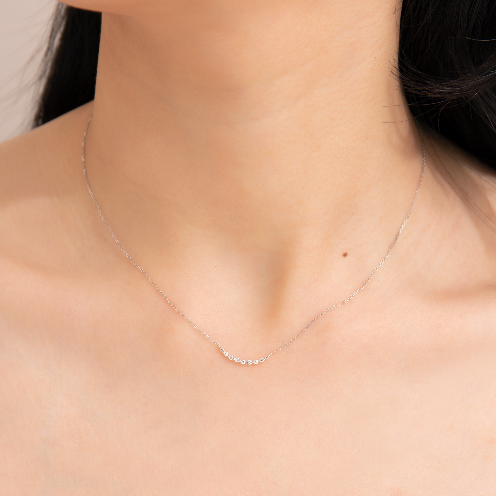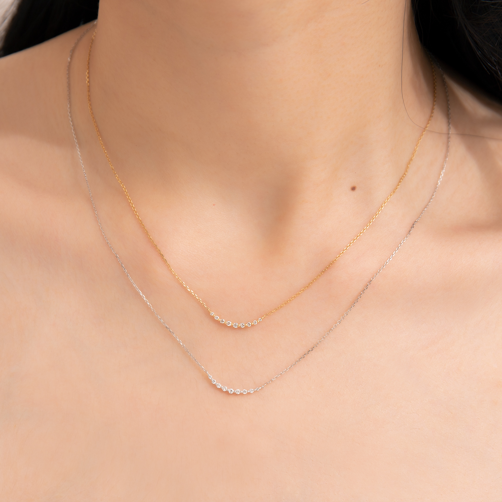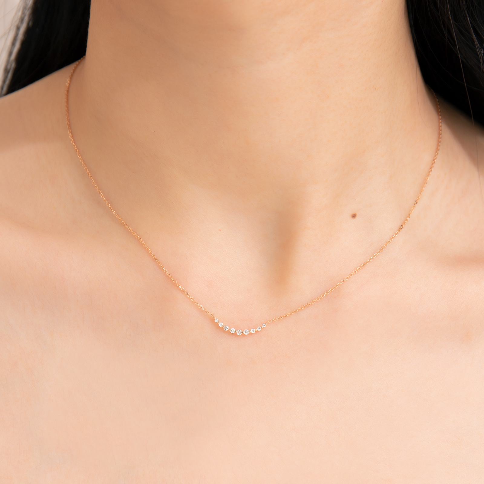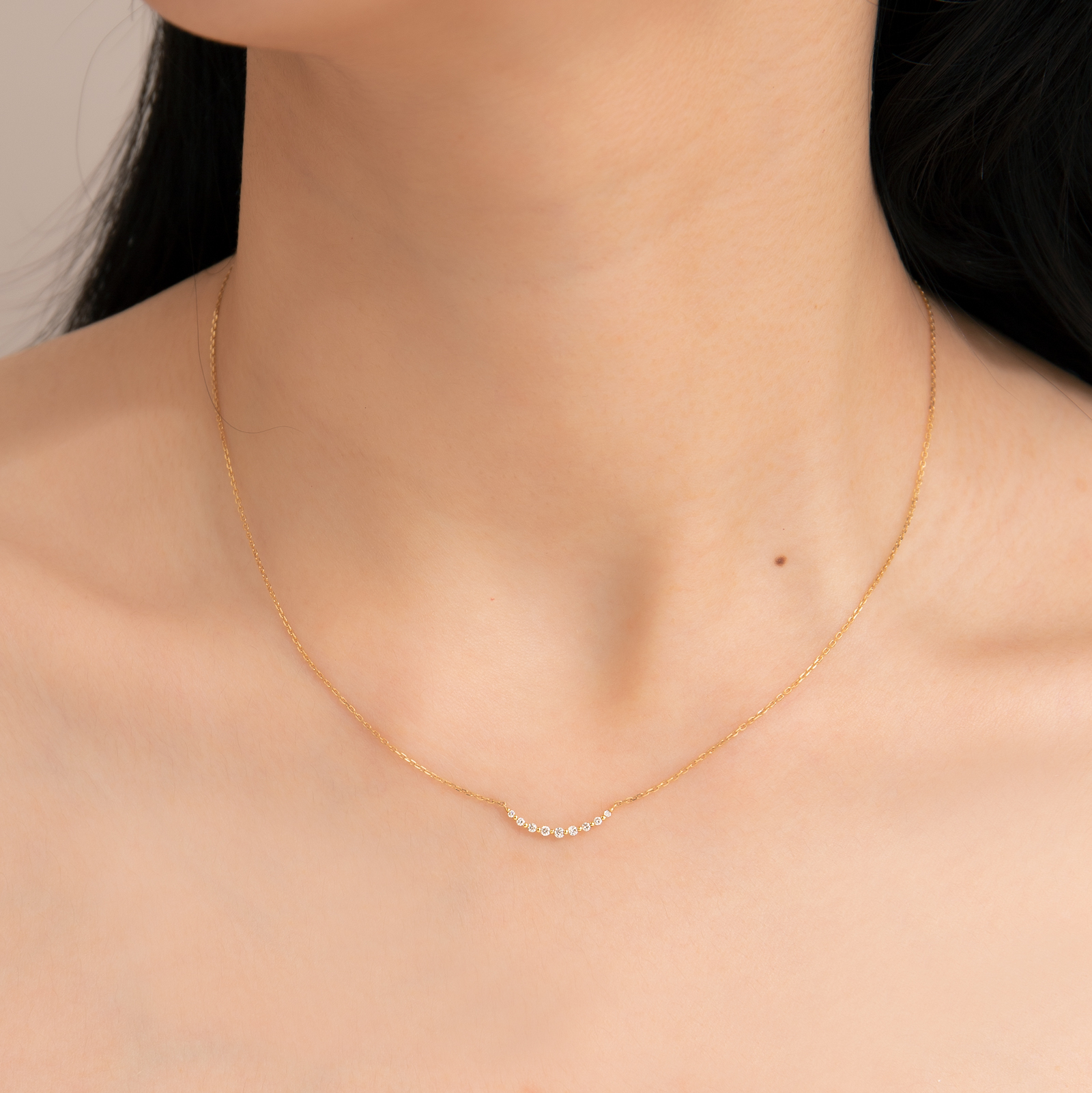 Delicate K gold chain paired with a gently curved pendant set with small diamonds, outlining a soft, smile-like silhouette.
