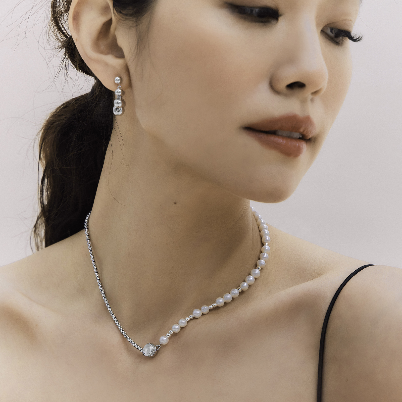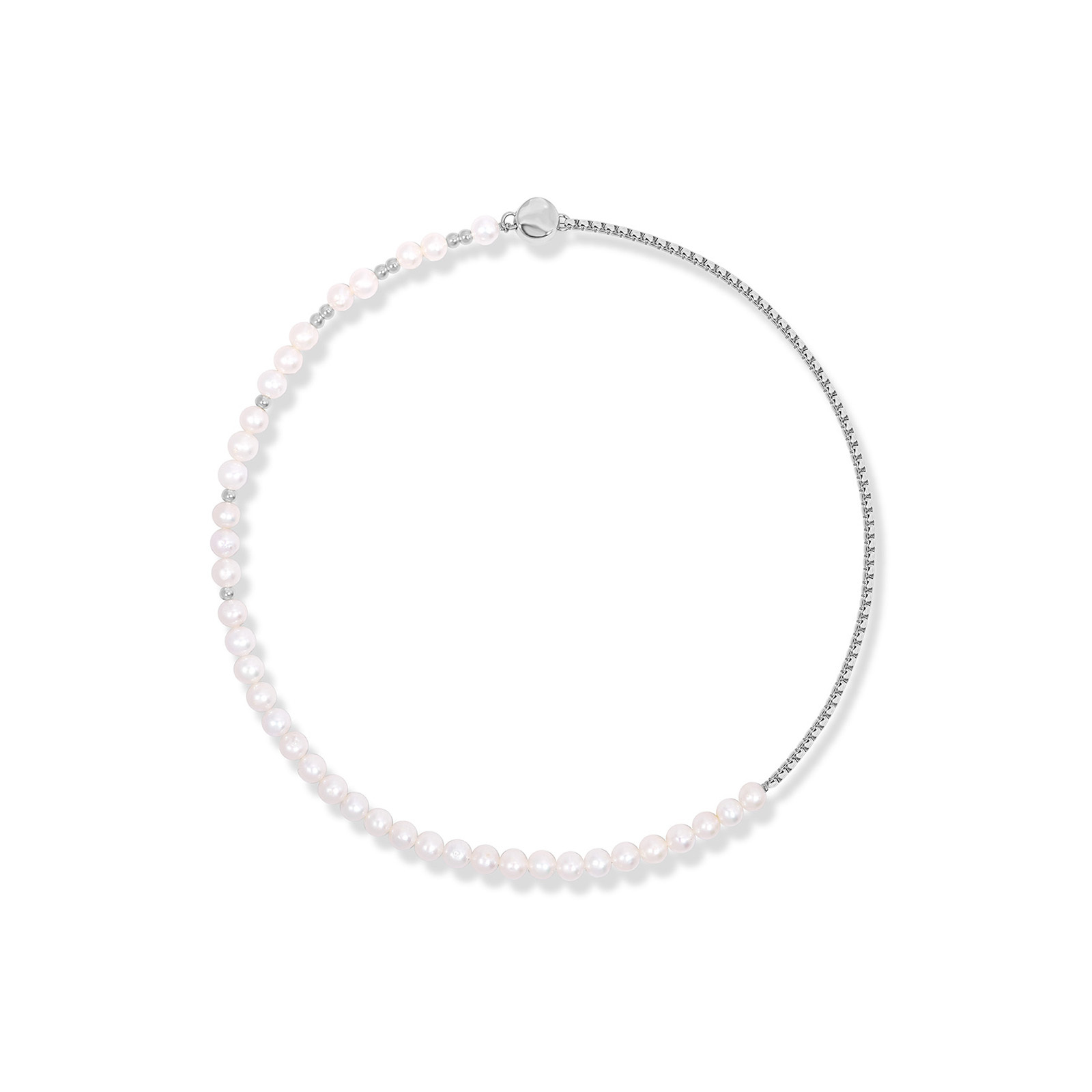 Natural pearls are arranged along an arc, paired with rhodium-plated sterling silver for a perfect balance of minimalism and soft radiance.