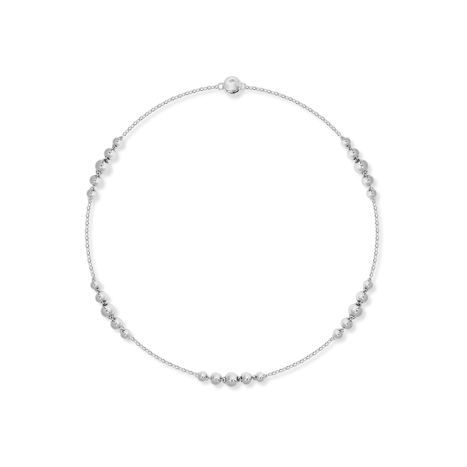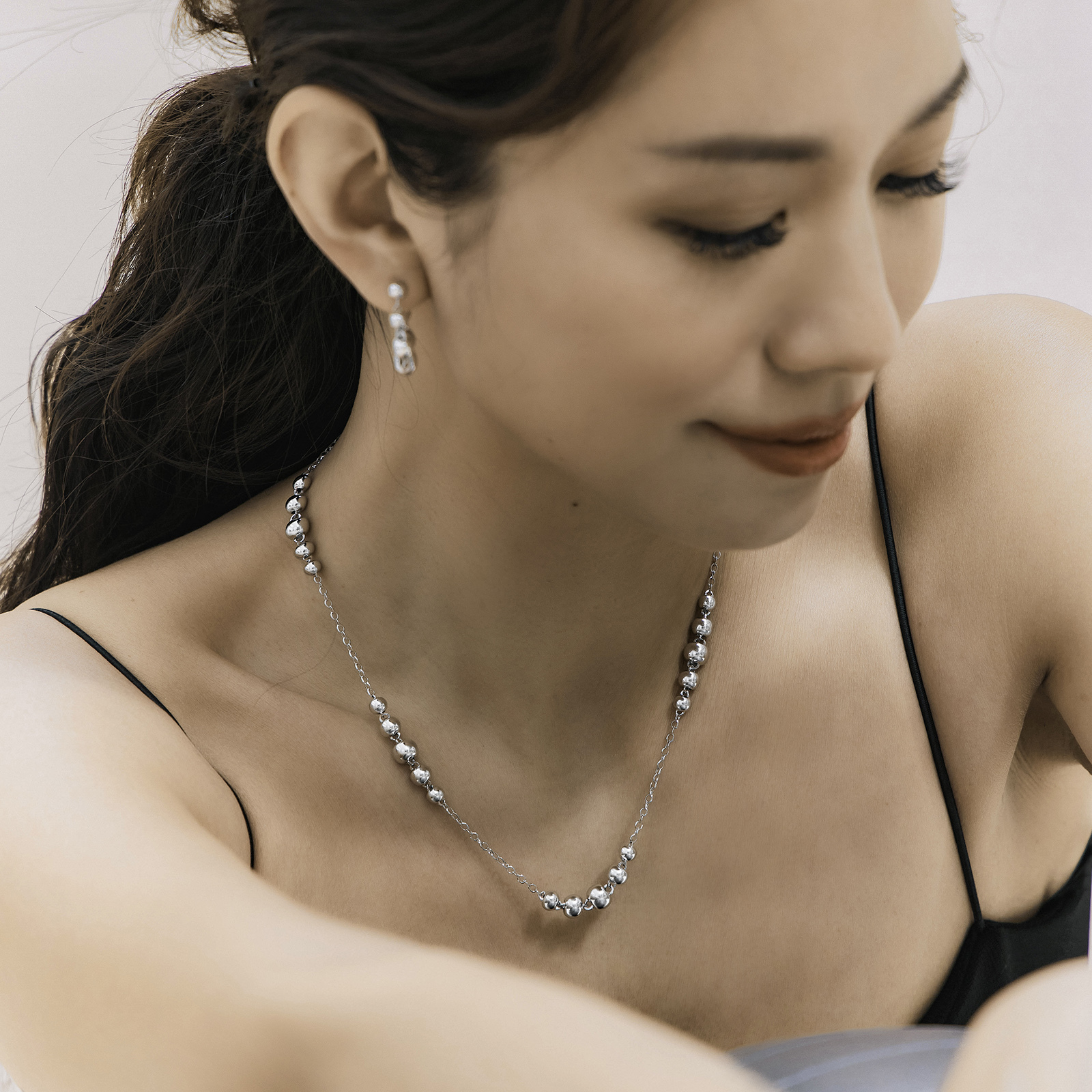 Rhodium plated sterling silver beads are arranged in a staggered rhythm, creating a sense of structured movement.