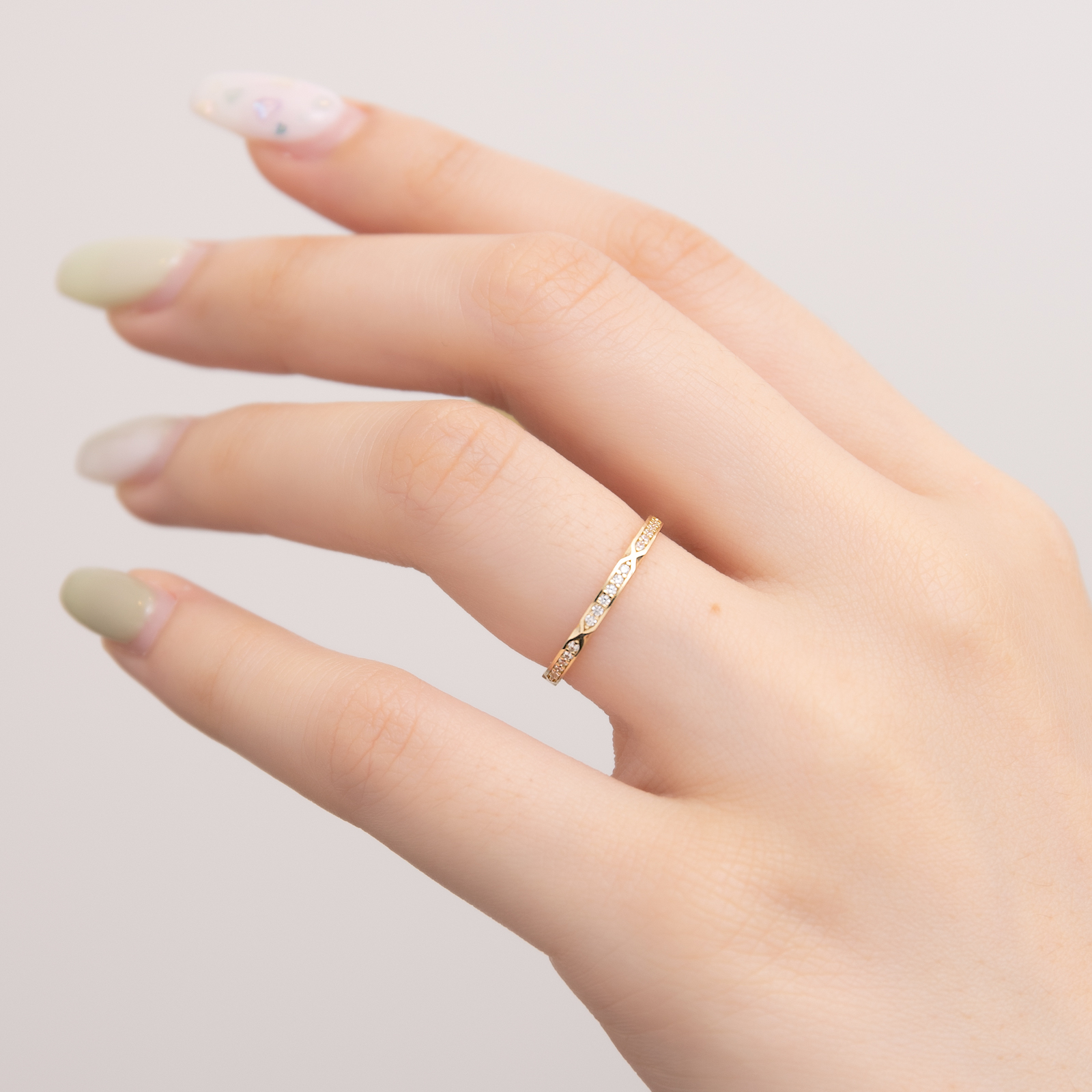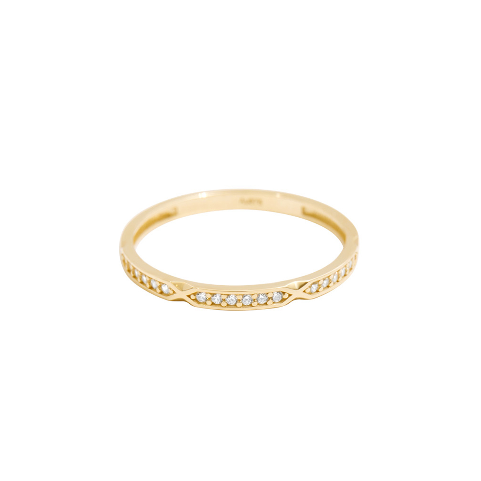 The 9K Gold Slim Ring features clean, smooth lines, with a gently arched curve that adds dimensional depth. The side is adorned with a delicate geometric cut design, reflecting elegant light and shine. Perfect for wearing alone or stacking with other rings to showcase a refined texture.