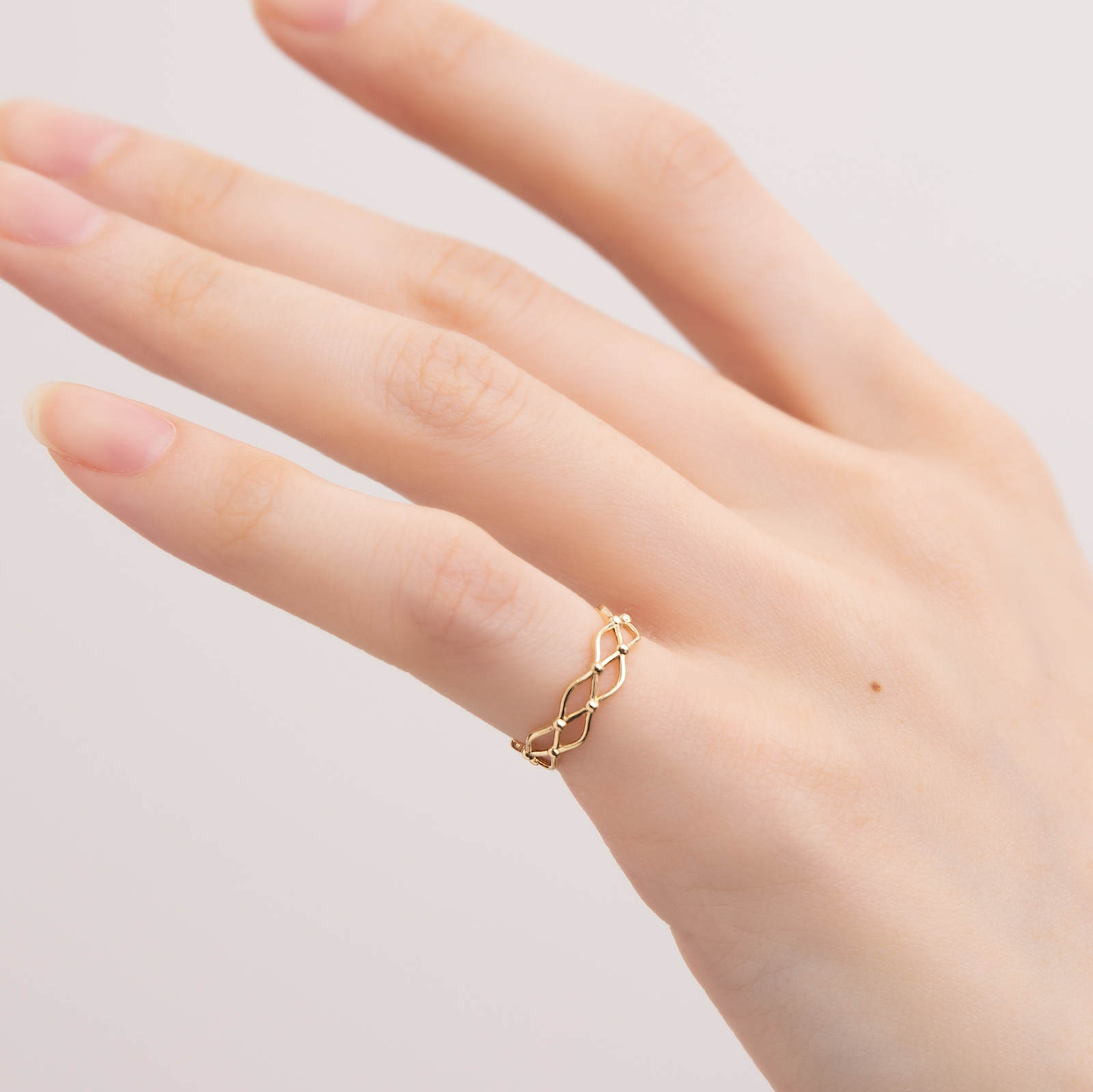 Interwoven lines create a delicate mesh-like structure, accented with tiny gold beads at each intersection.