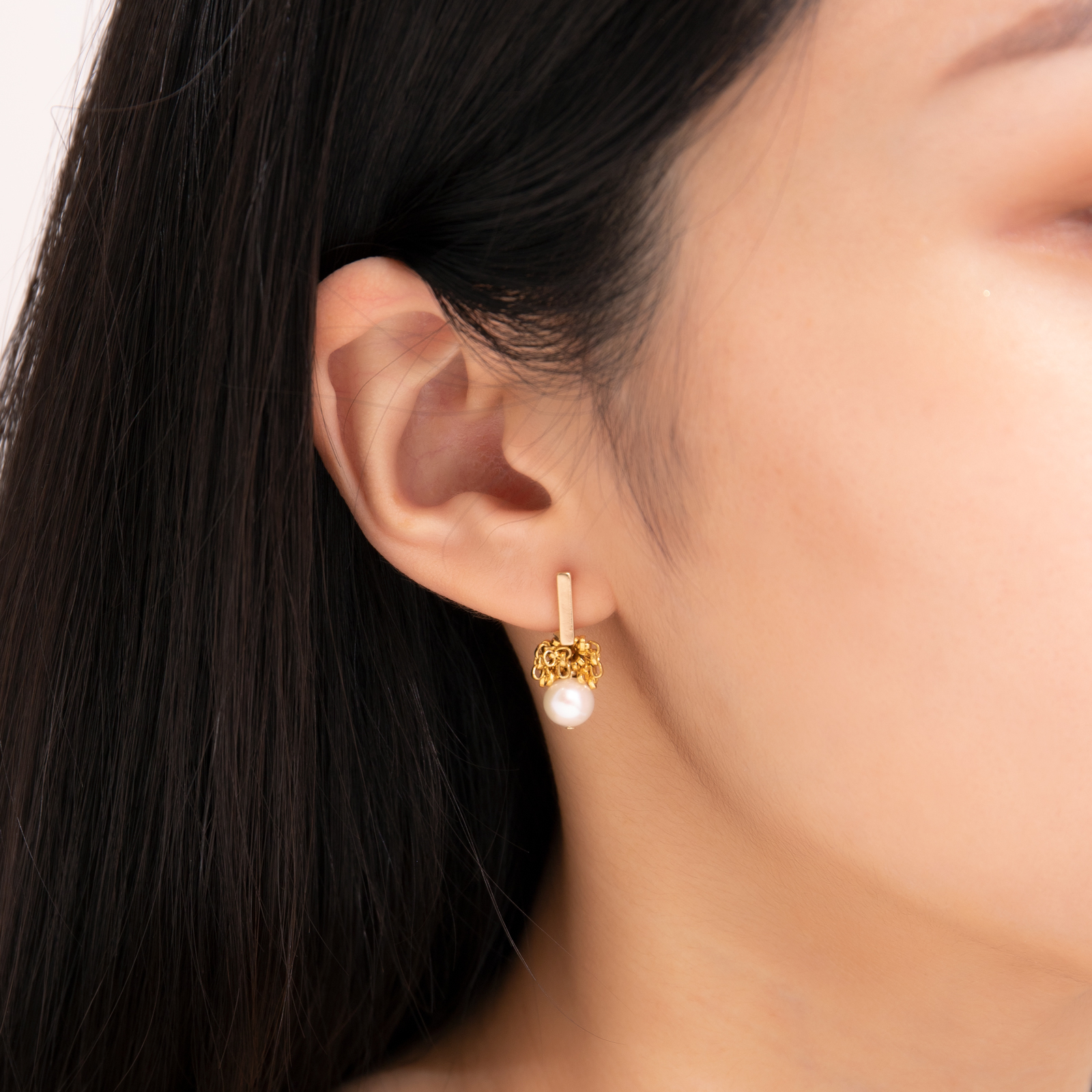 The gold-plated straight column structure is paired with handcrafted tassels, connecting a smooth freshwater pearl.