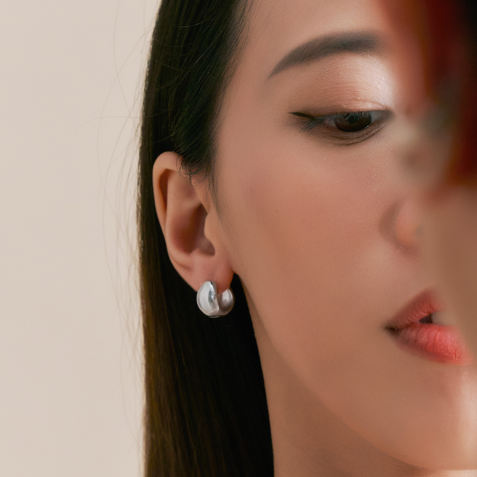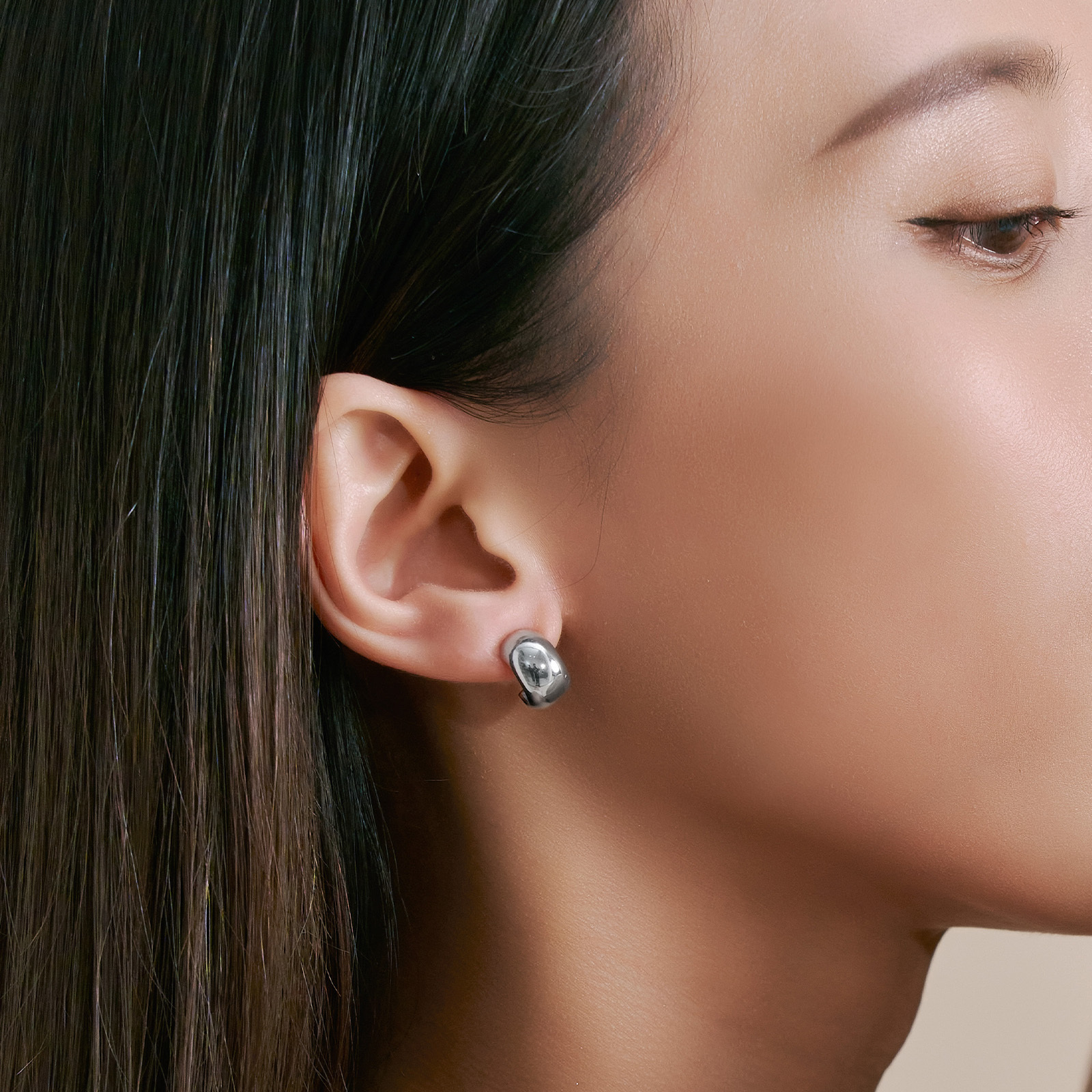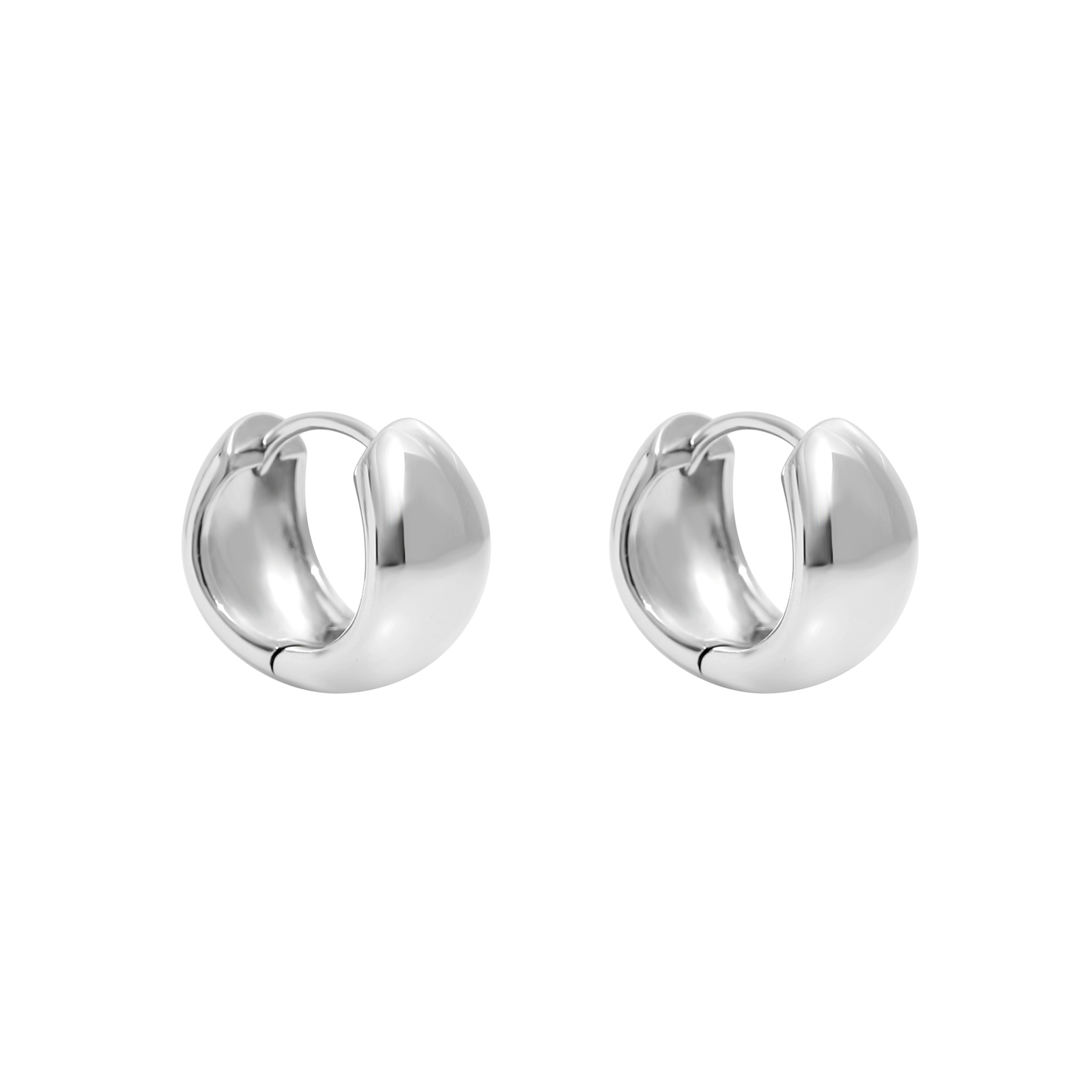 Sterling silver hoop earrings featuring a sleek, curved design that highlights the metal's refined luster and substantial feel. With a minimalist and stylish look, they are gender-neutral and effortlessly complement any outfit, adding a touch of personality to everyday wear.