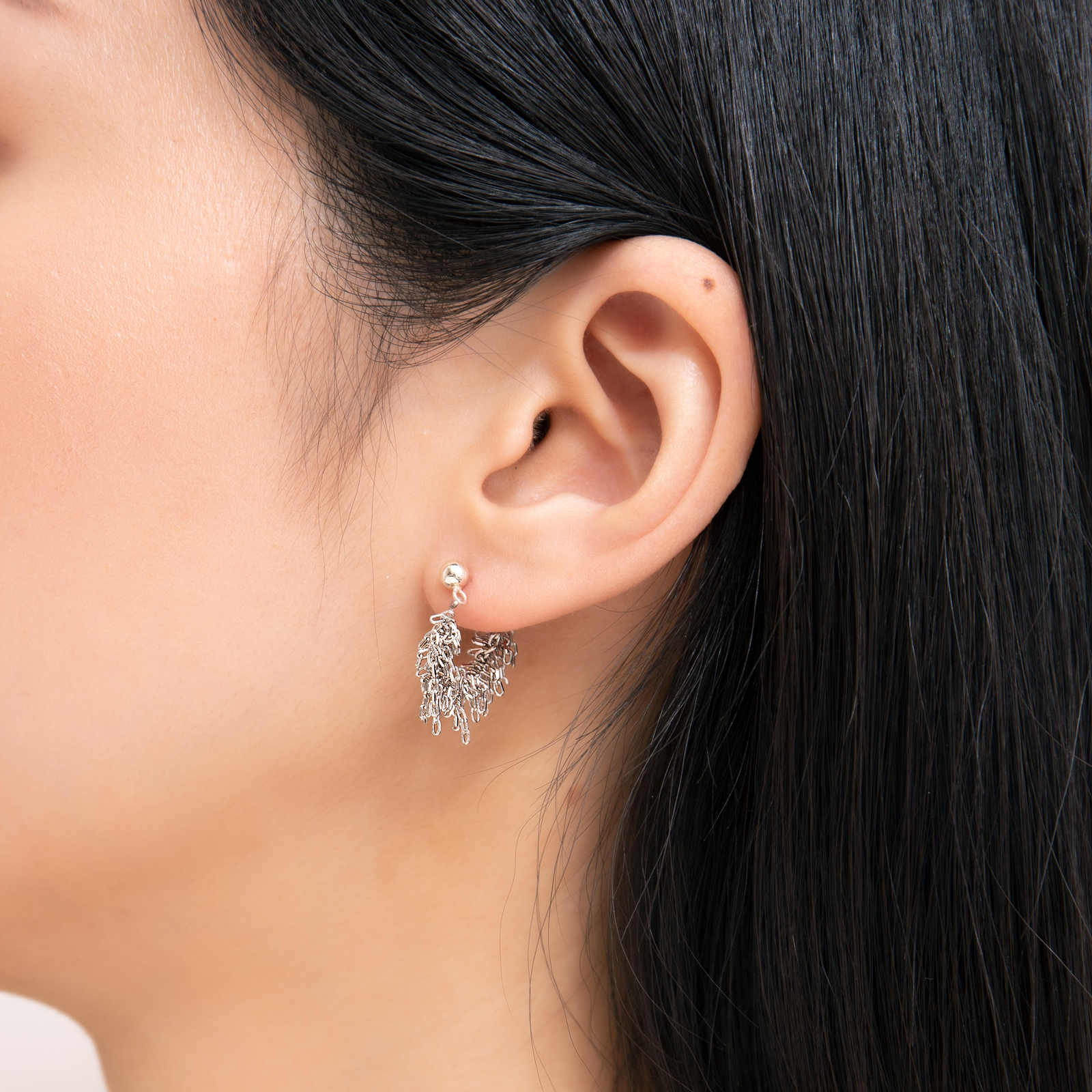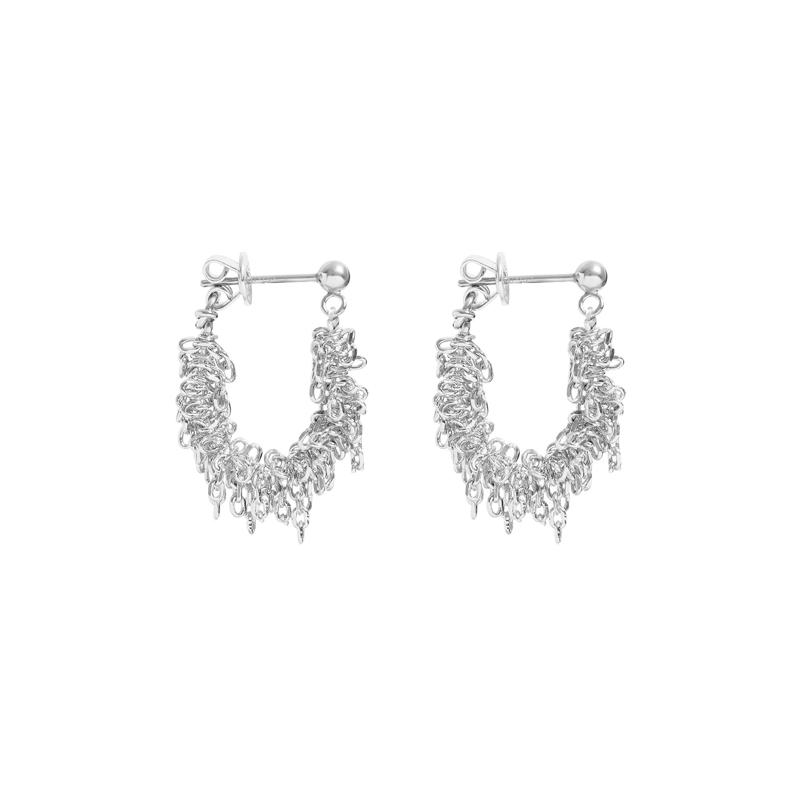 Handcrafted fine chains form a semi-circle structure, with layers of 925 sterling silver and rhodium-plated brass stacked together,