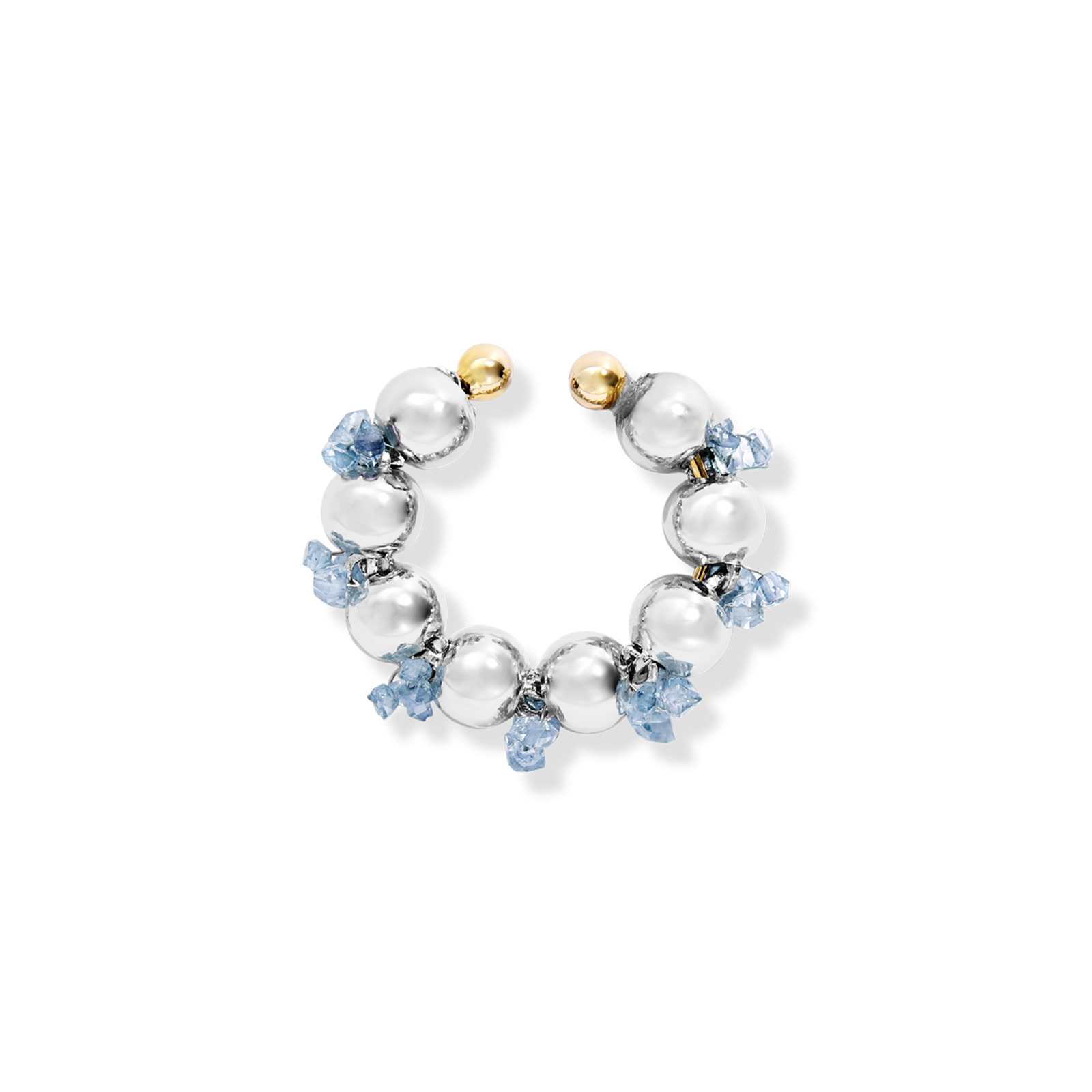 Hand-polished plump silver beads are arranged along the ear,