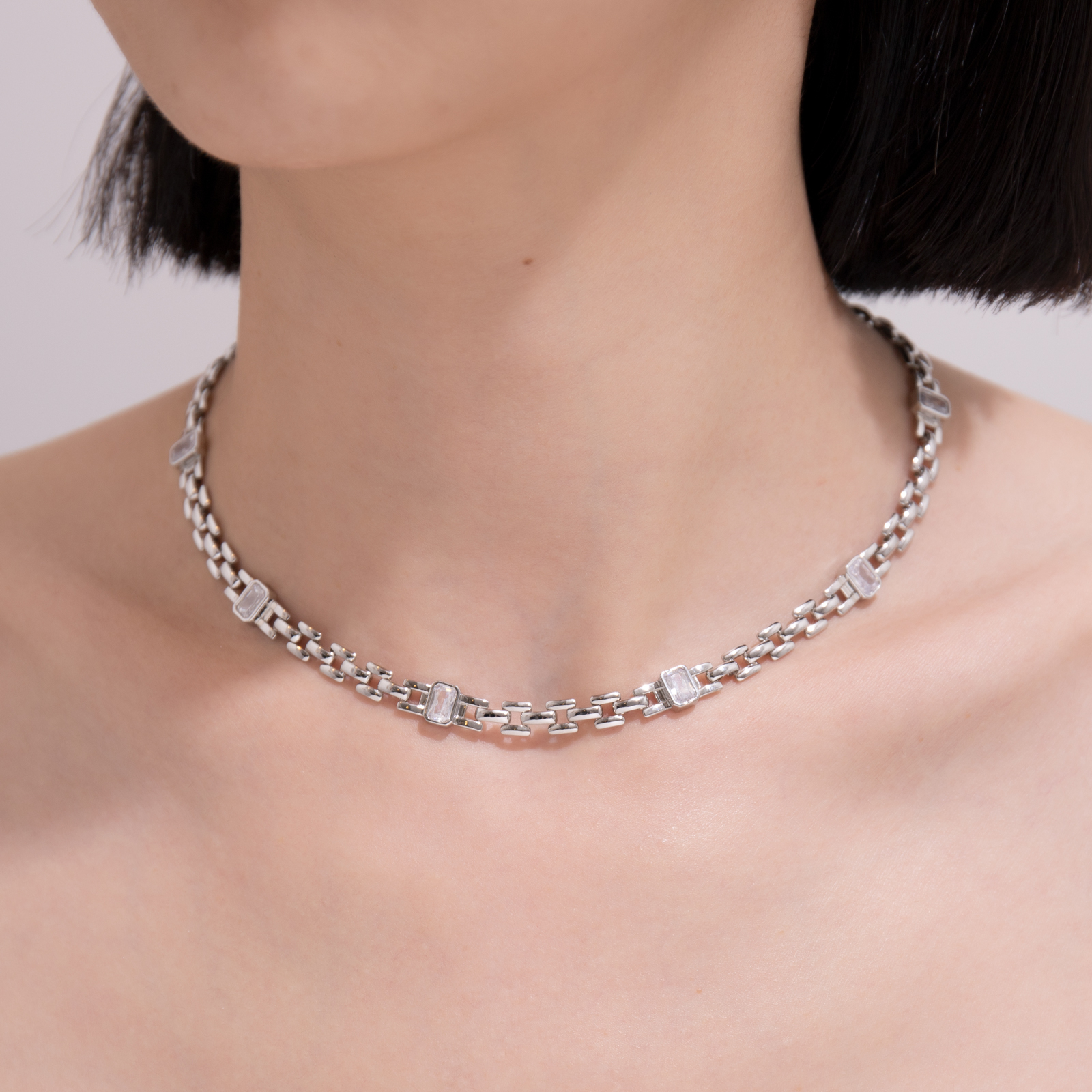 Inspired by the concept of soulful connections, this design combines a classic watch strap chain with rectangular zircon stones, symbolizing the beauty of kindred spirits coming together.
