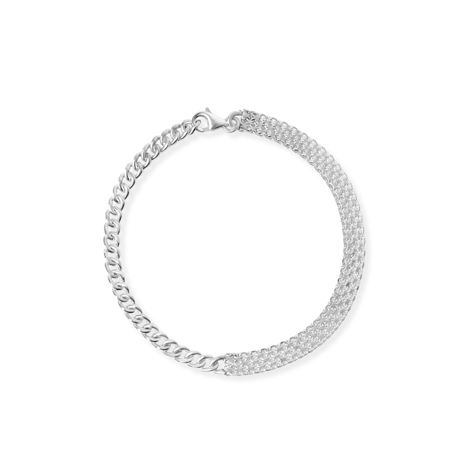 Combining different types of chains, the heavier links accentuate the delicate luster of sterling silver. The woven metal fabric interlaces with the links, adding versatility to the piece. It’s perfect for stacking with other bracelets, showcasing rich layers and styles.
