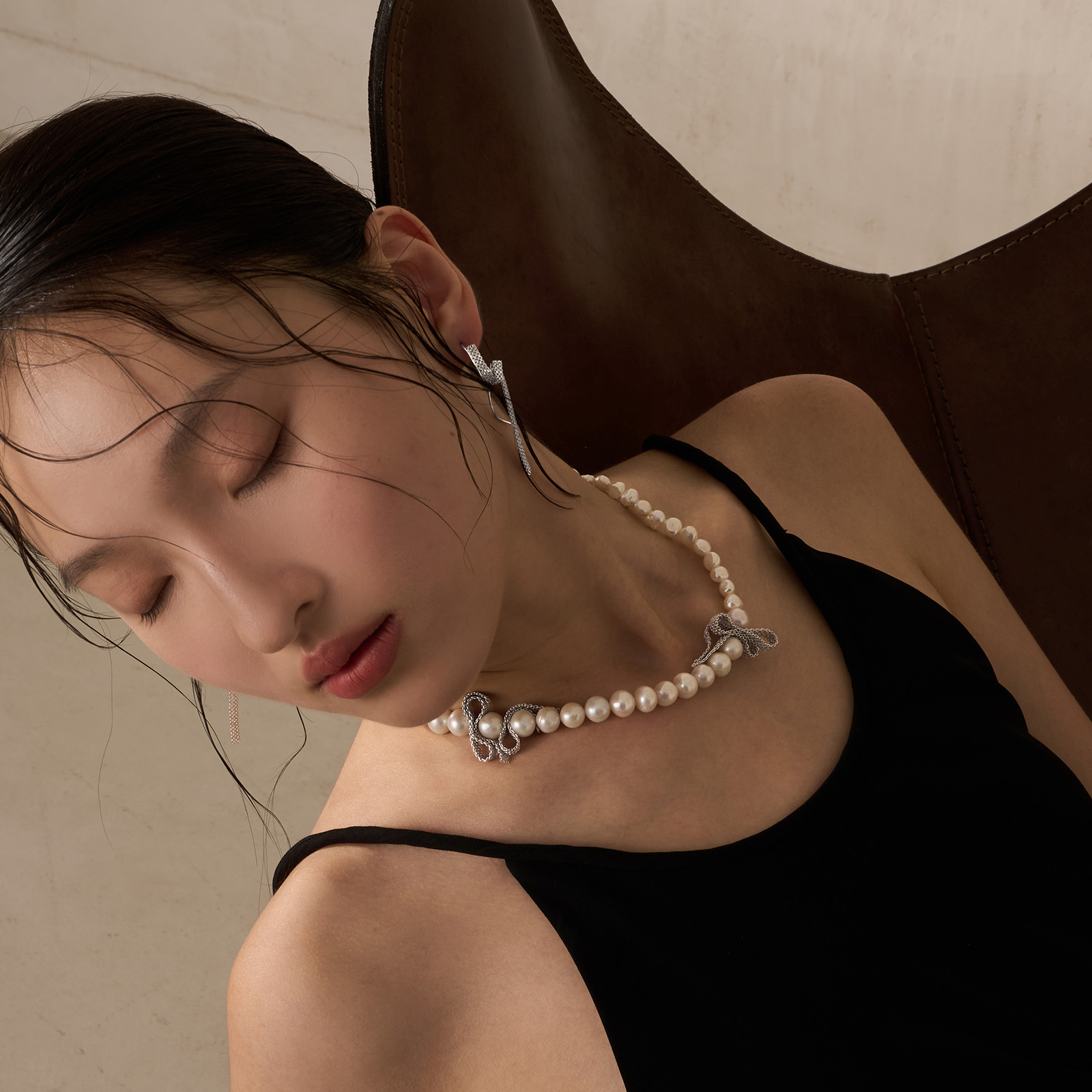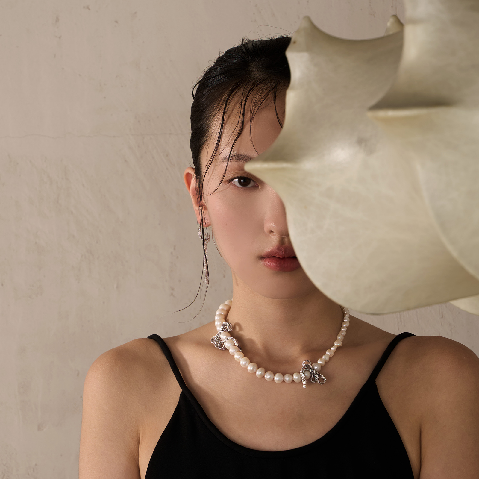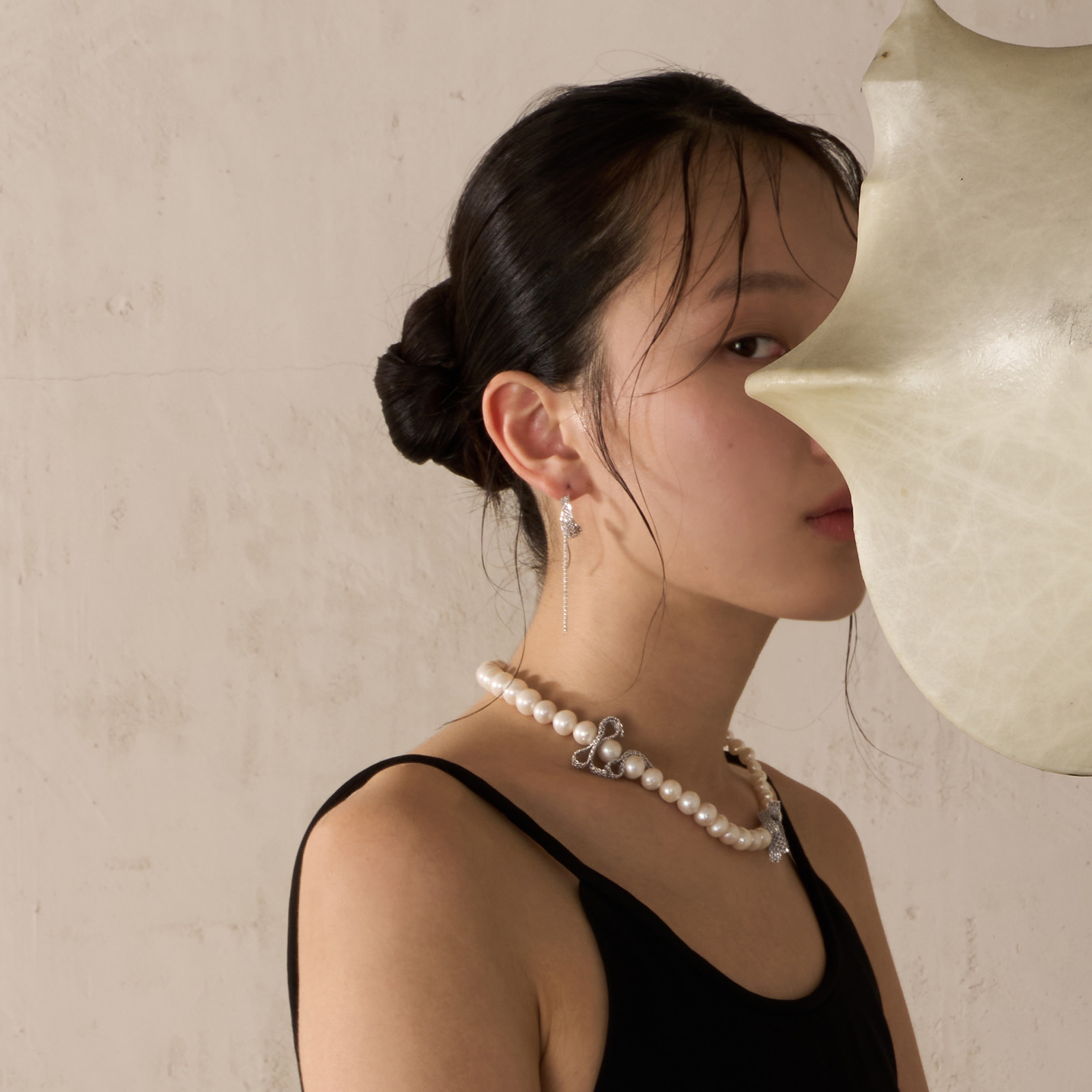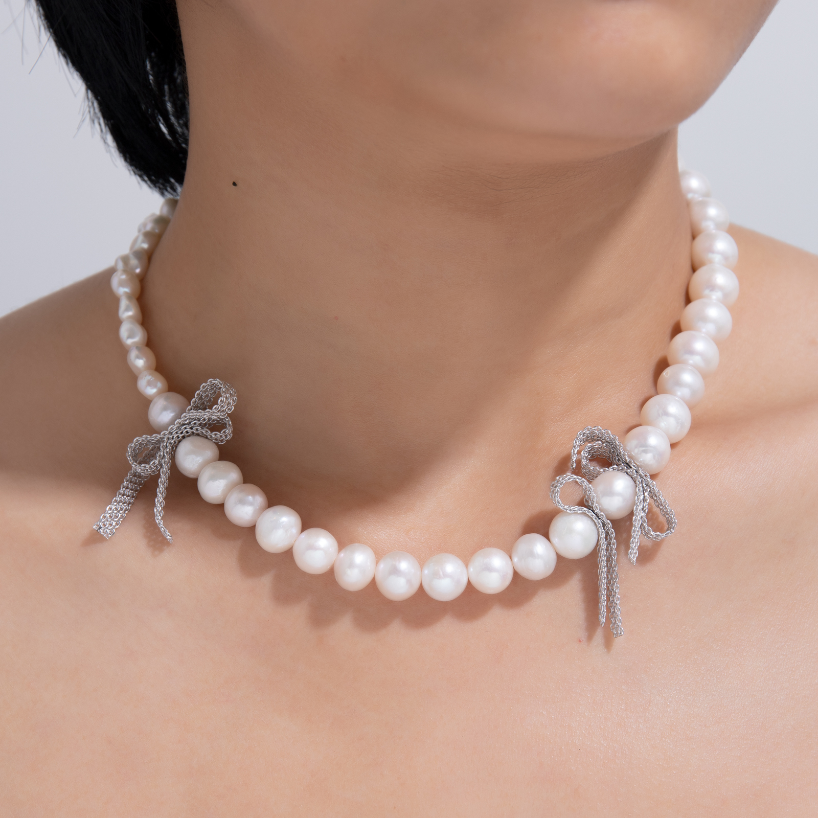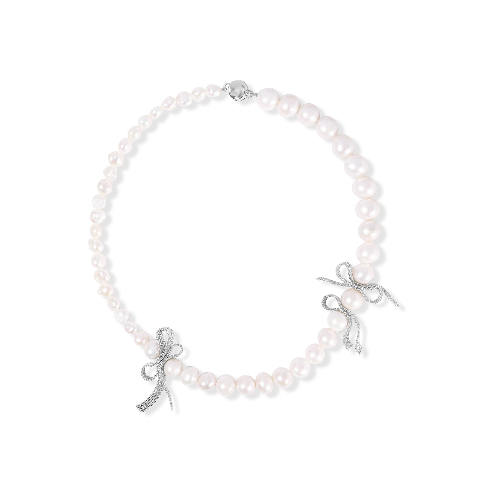 A three-dimensional bow is intricately woven from fine silver chains, interlacing between 9–10mm white oval pearls and 7–8mm double-sided, nucleus-free pearls.