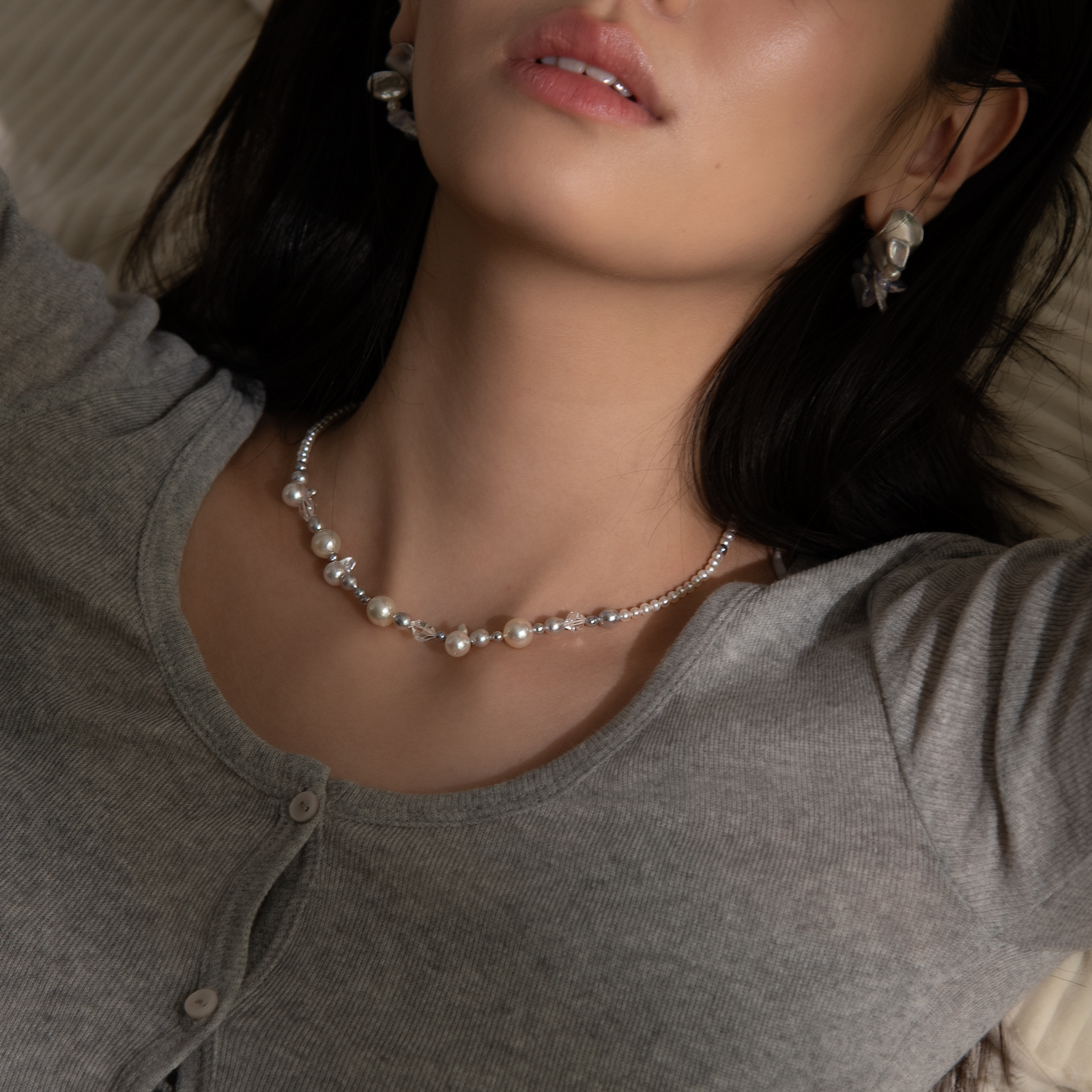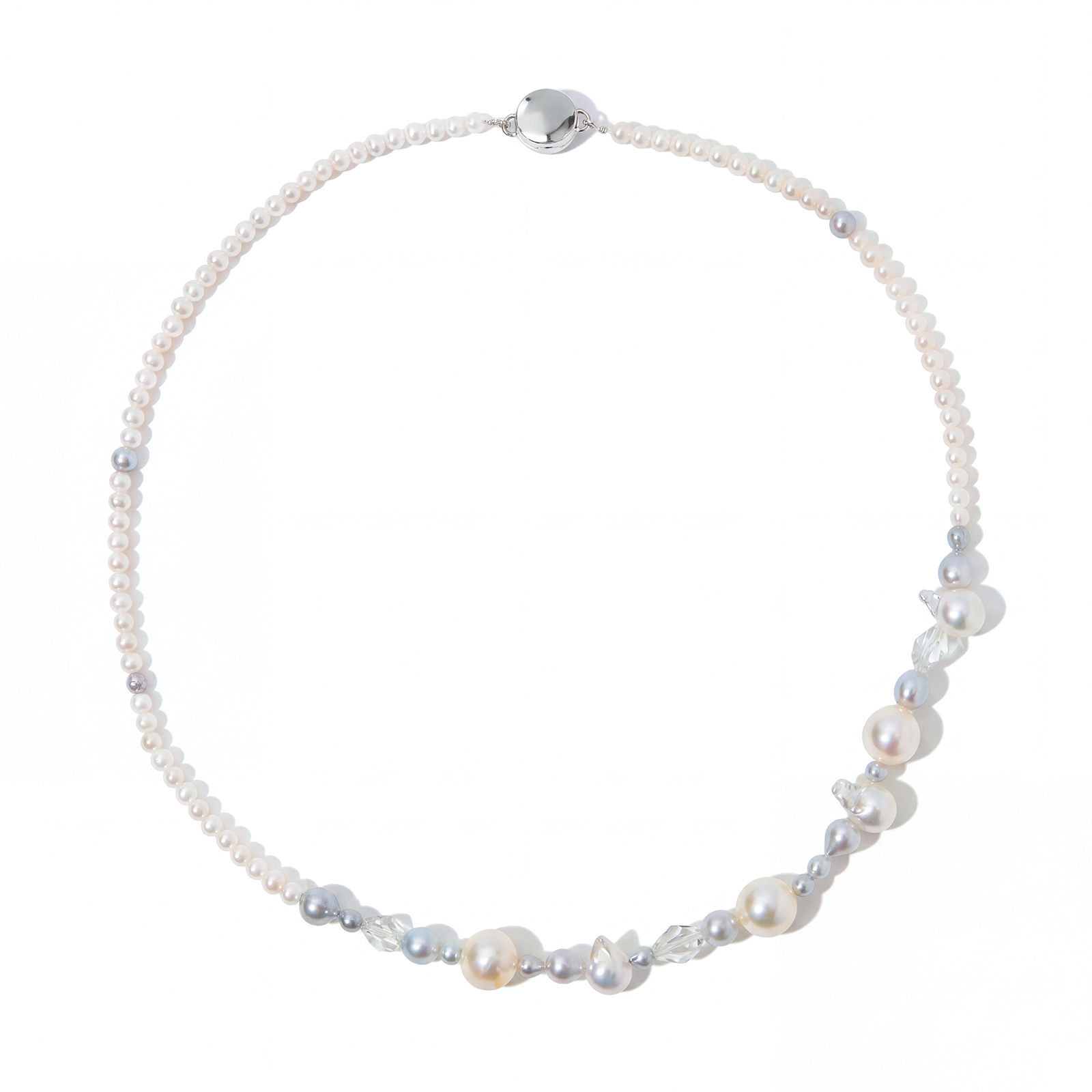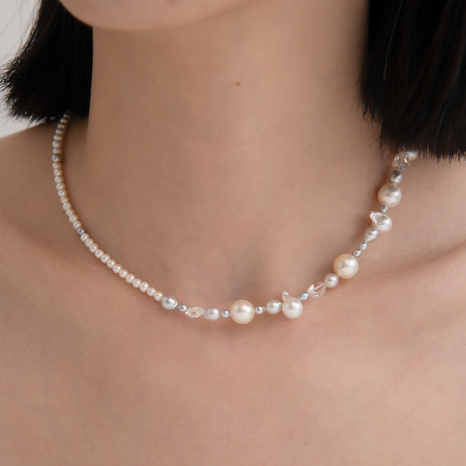 不規則型的海水珍珠、細粒淡水珍珠的輕盈排列,赫基蒙水晶的透明碎光穿插其間,如含苞待放的花朵靜靜生長於花園之中,落於頸間,自然而不刻意。