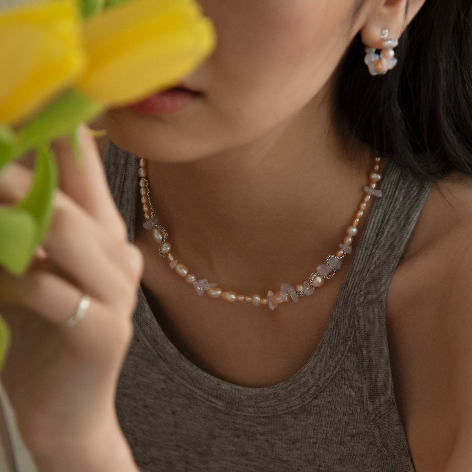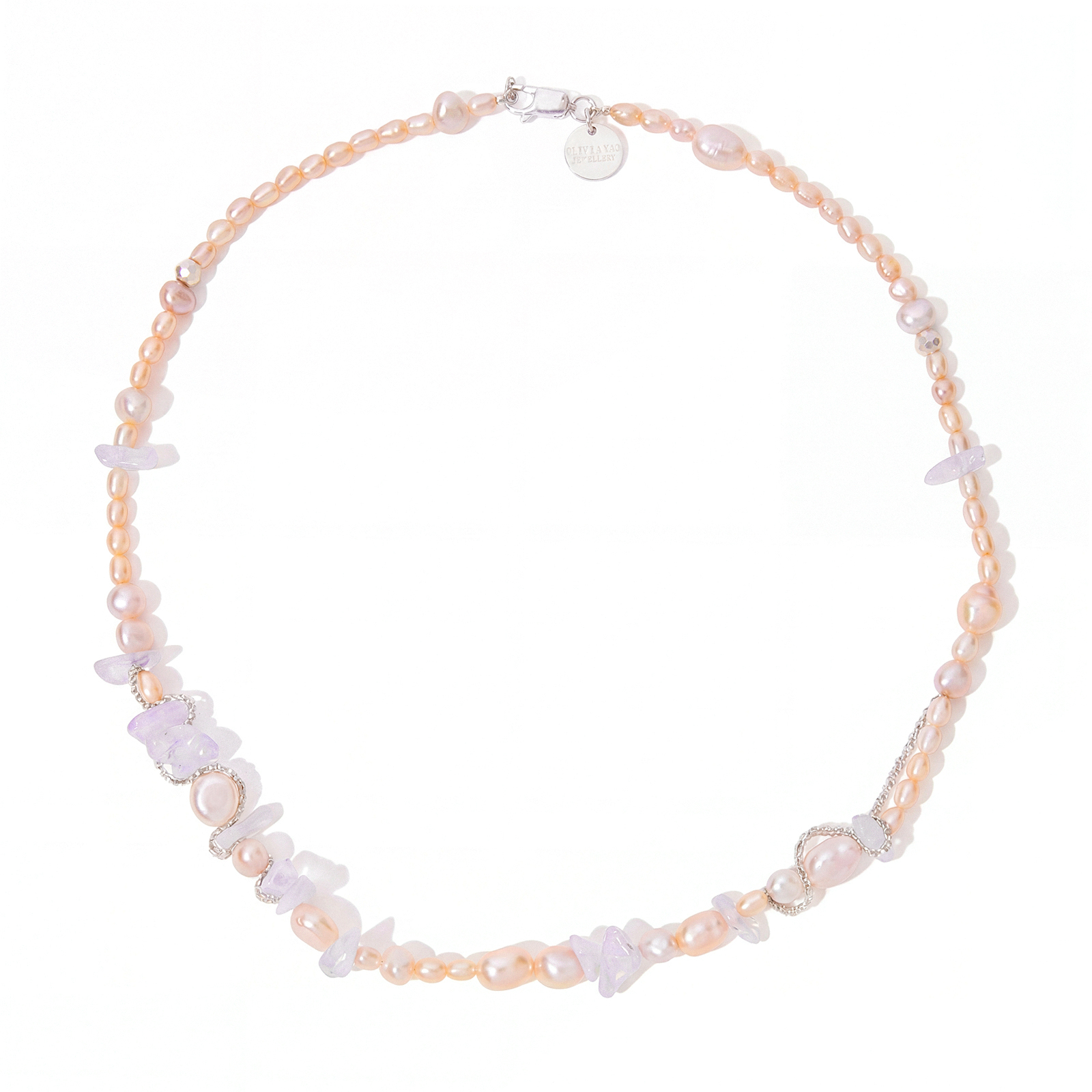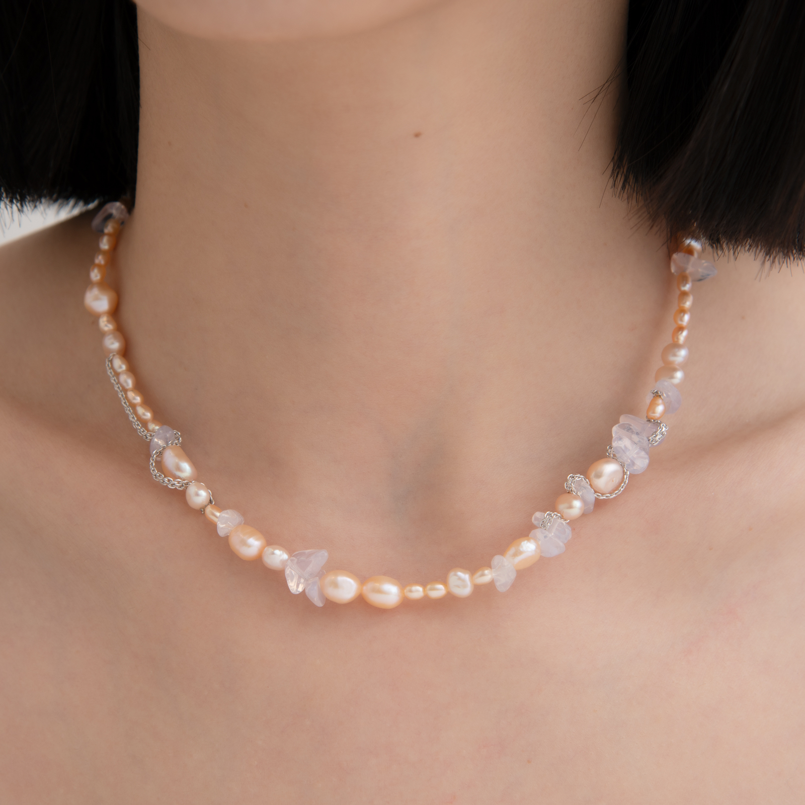 天然粉珍珠的溫潤光澤,搭上薰衣草紫水晶的通透碎光,兩種截然不同的質地,在銀鍊的串連下調出剛剛好的春日色調,適合搭配白色或奶油色系的棉麻上衣,讓項鍊的粉紫色調自然浮現,優雅中帶一點隨性的春日感。