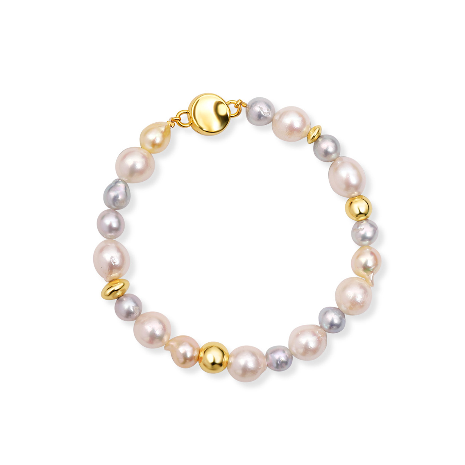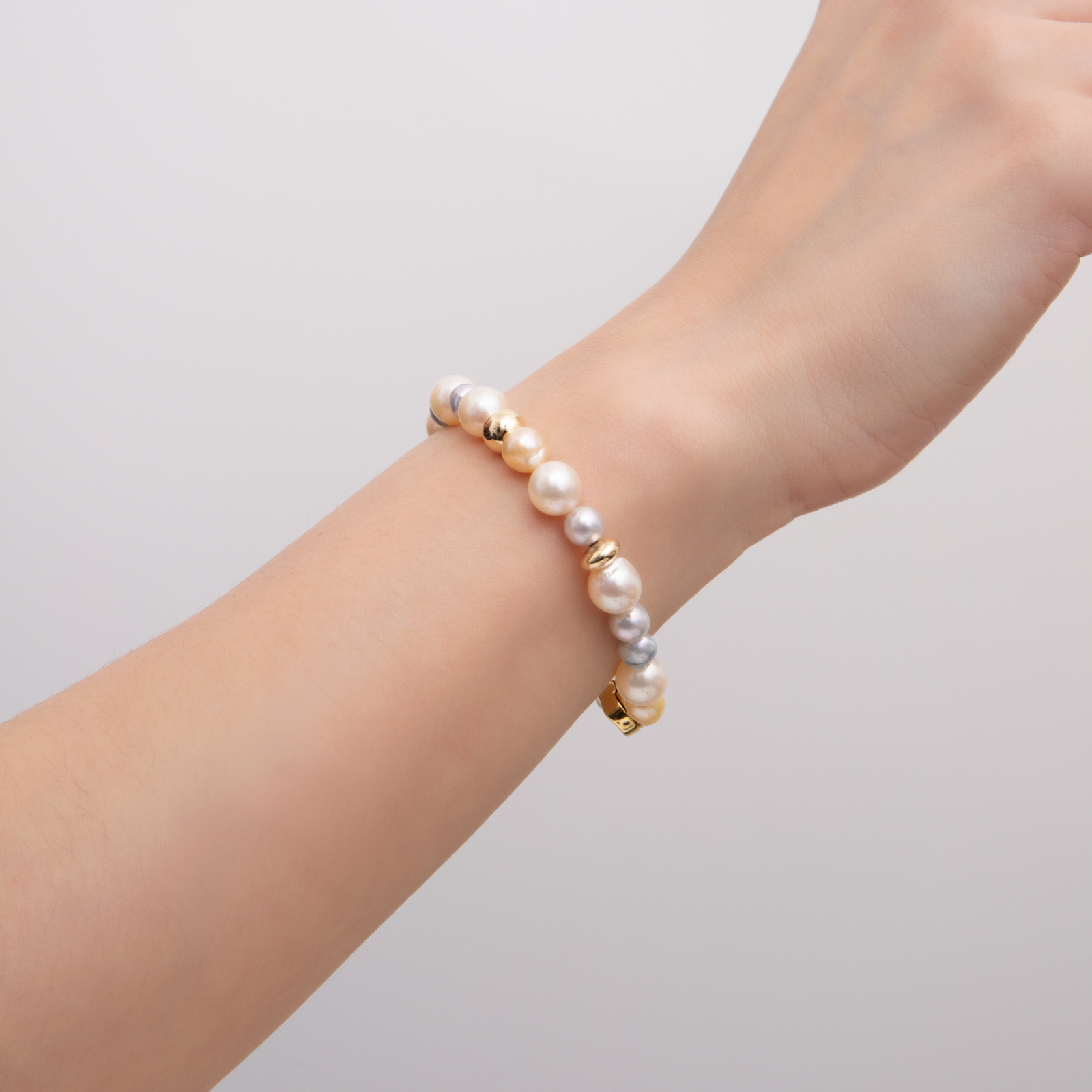 This bracelet showcases lustrous Akoya pearls in soft ivory, blush pink, and silvery gray, artfully arranged for effortless elegance.