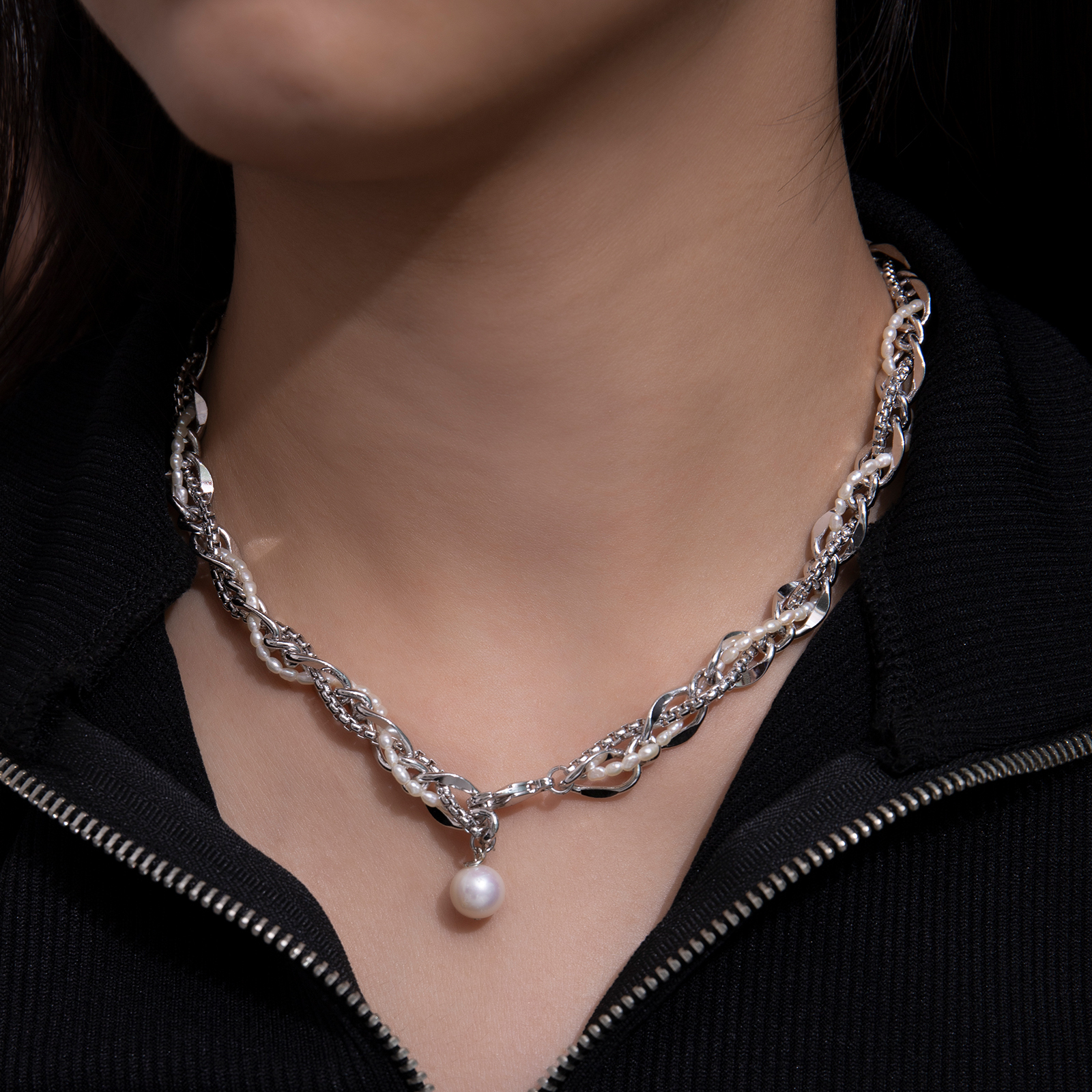 Mesh|銀色編織鎖鍊珍珠項鍊