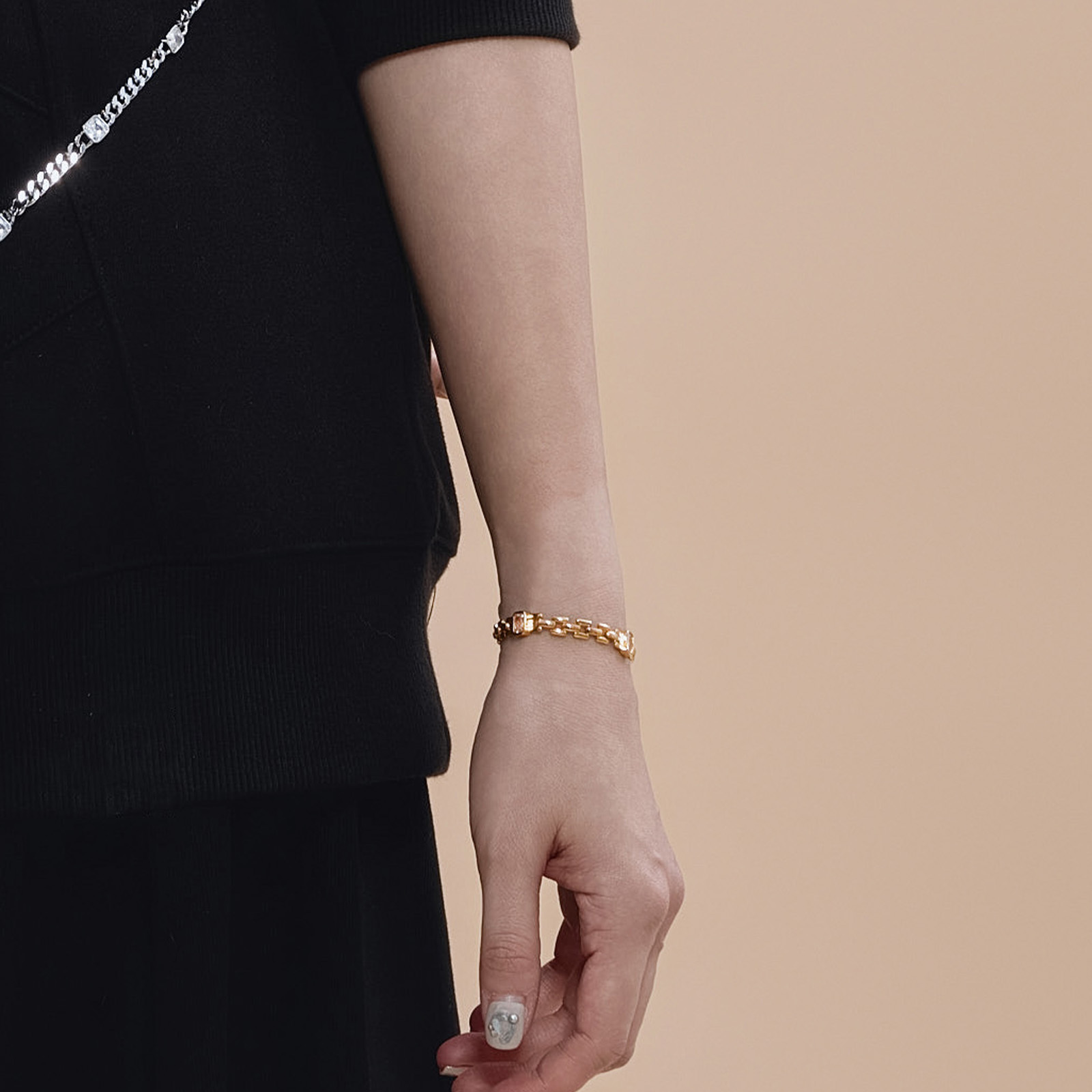 This piece is inspired by the concept of soulful connections, featuring a classic watch strap chain paired with rectangular zircon stones, representing the beauty of kindred spirits coming together.